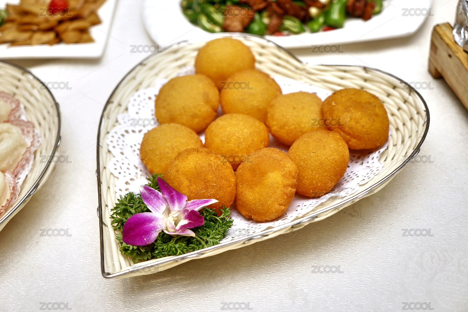 中国传统菜品糯香南瓜饼放在白色心形竹篓中