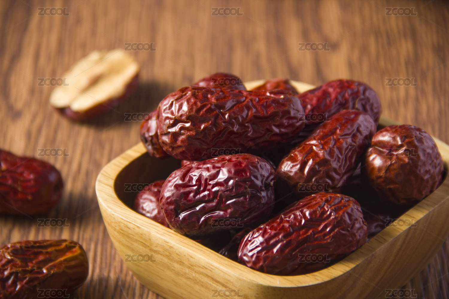 放在原木质感的桌面上的一盘红色的中国红枣