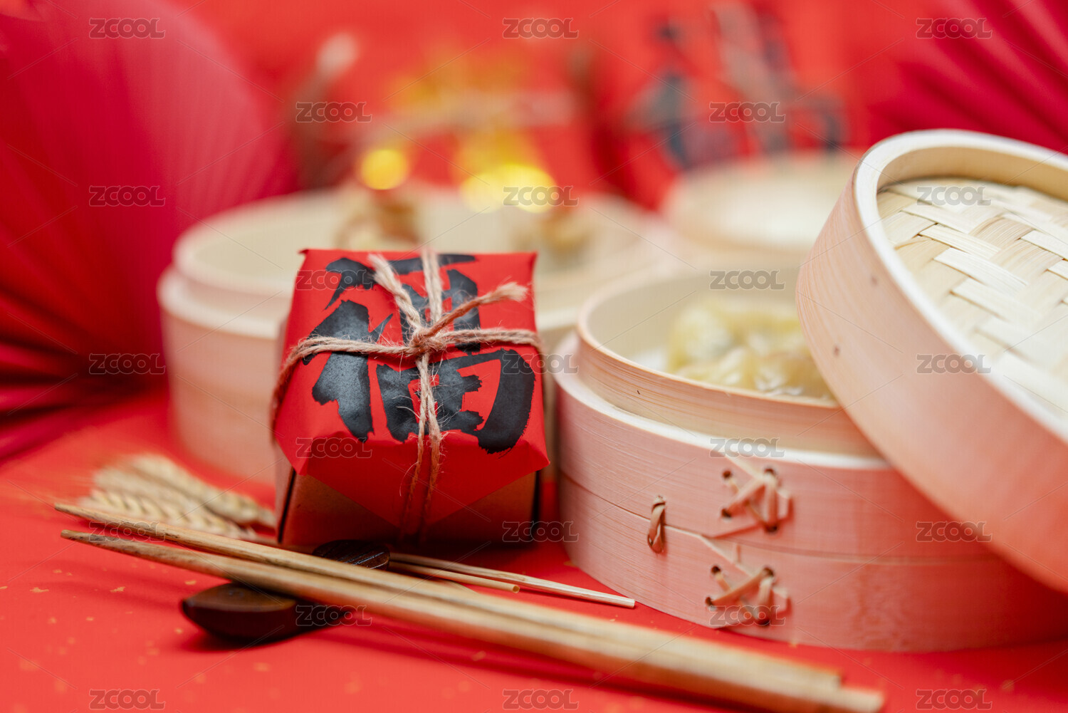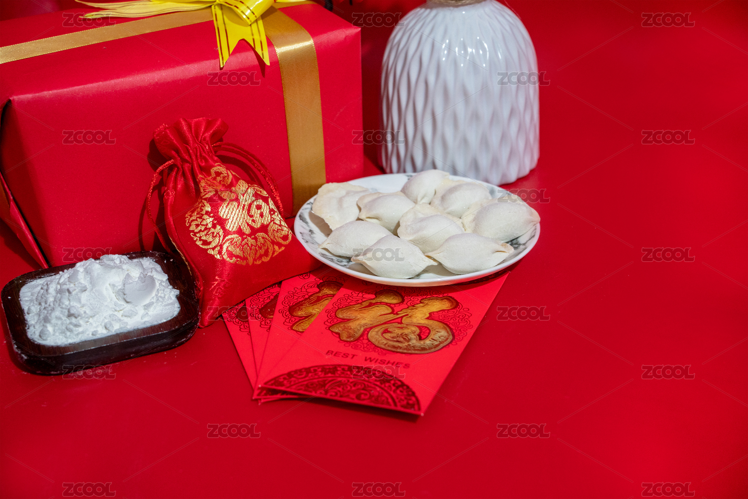 室内棚拍红色中国风背景前的一碗煮熟的元宵