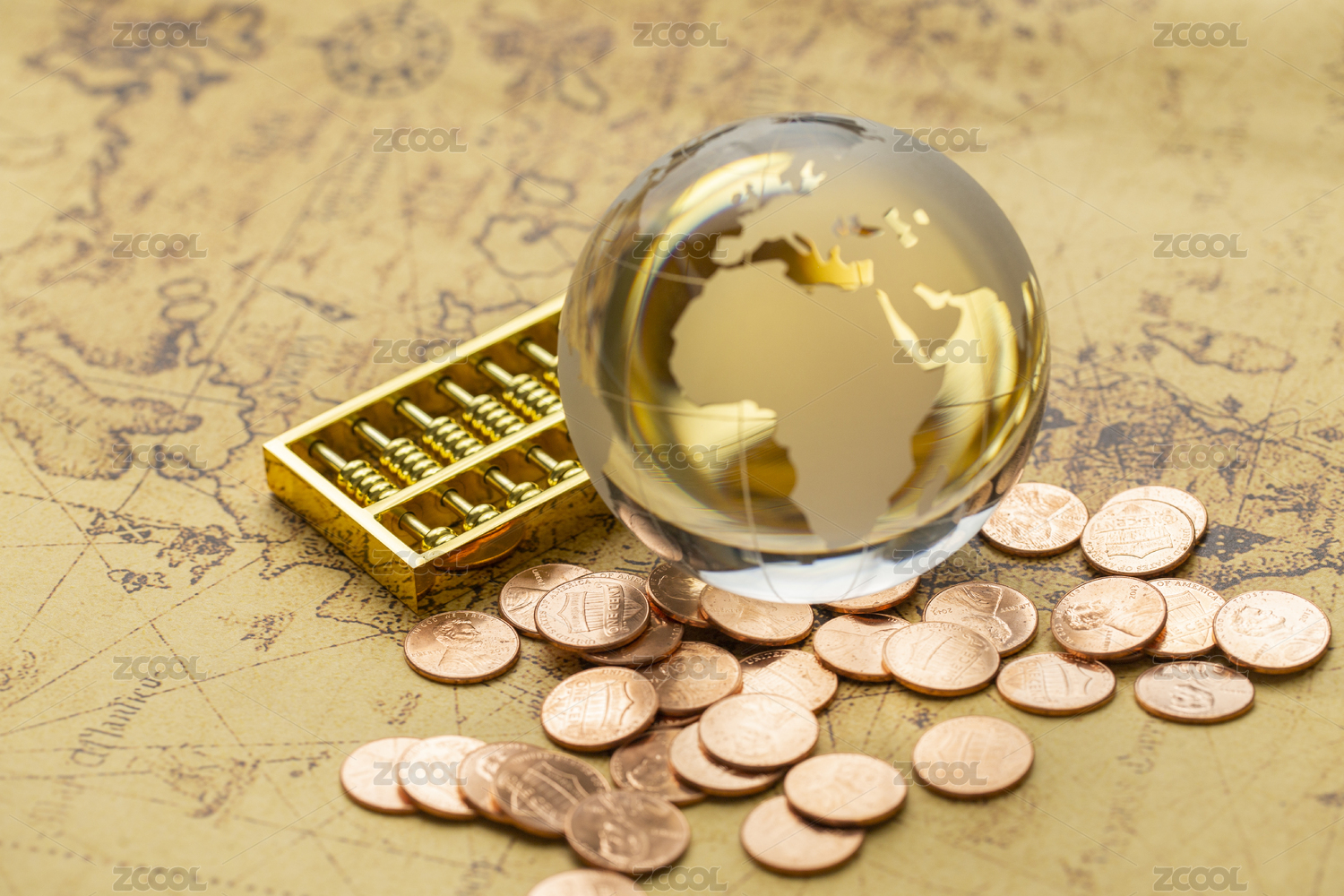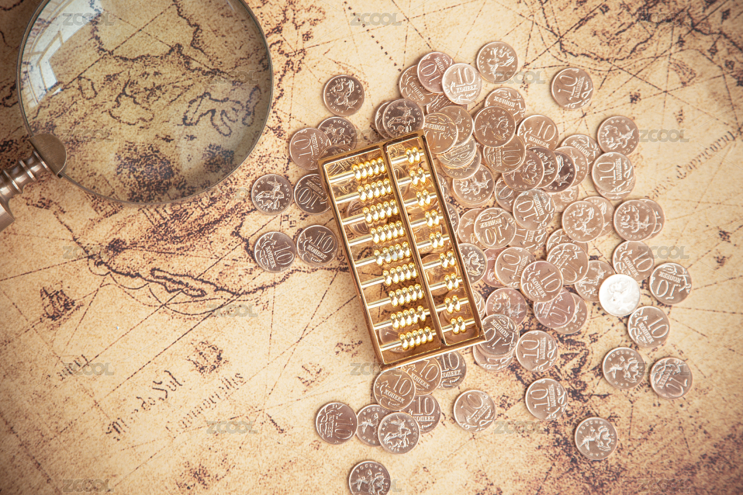 金融商务 硬币 美元大钞 指南针 地图 放大镜