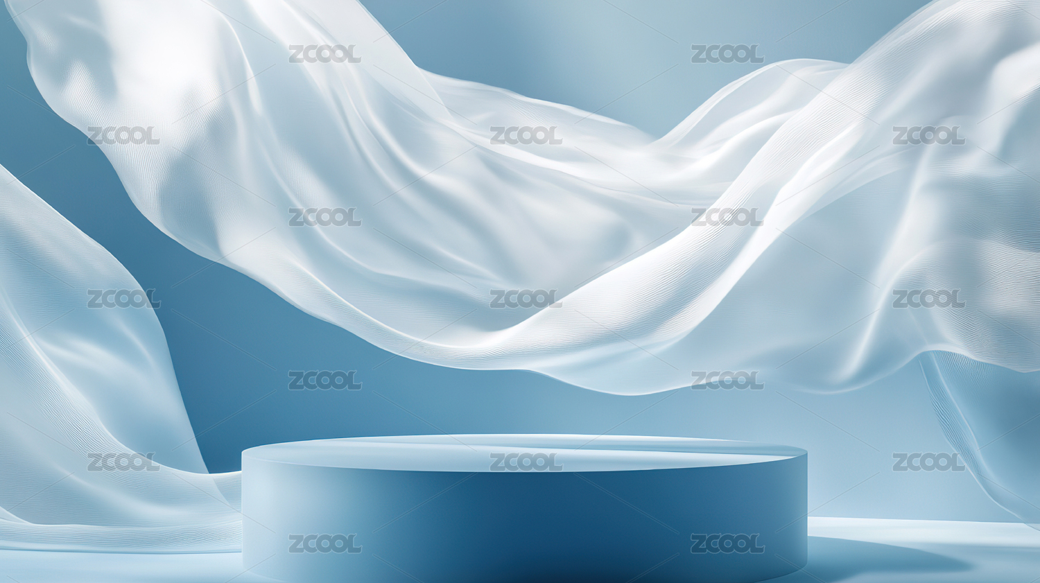 白色圆形讲台,展示台,浅色,地面,透明,蓝色布料,背景,模糊的,薄纱,透明材料