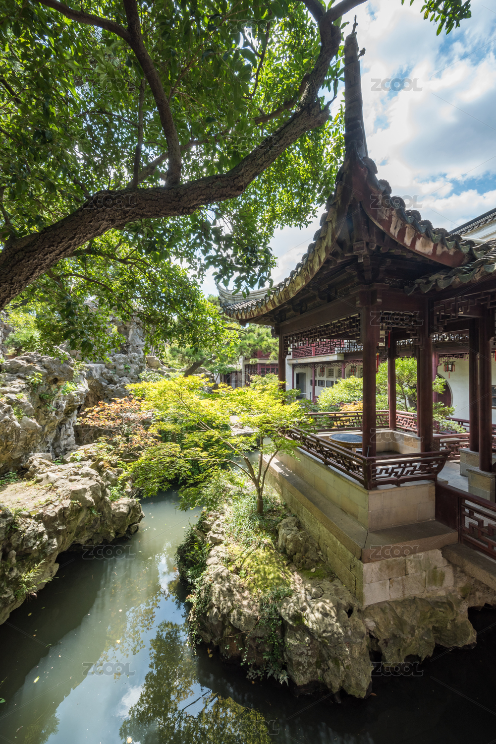 中国苏州留园的冠云峰和冠云楼和浣云沼