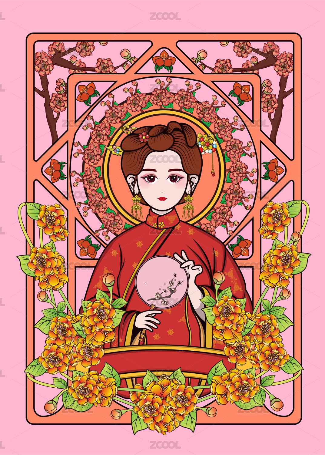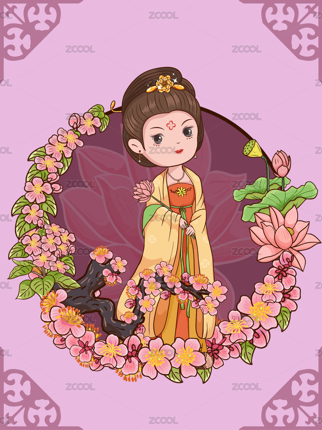 国潮风格拿着莲花的国风女孩插画手账贴纸
