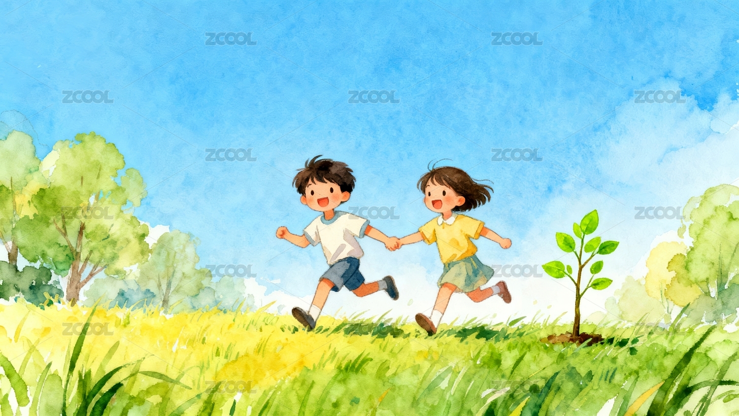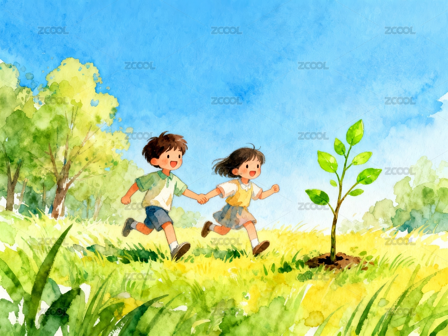 儿童植树水彩环保公益场景