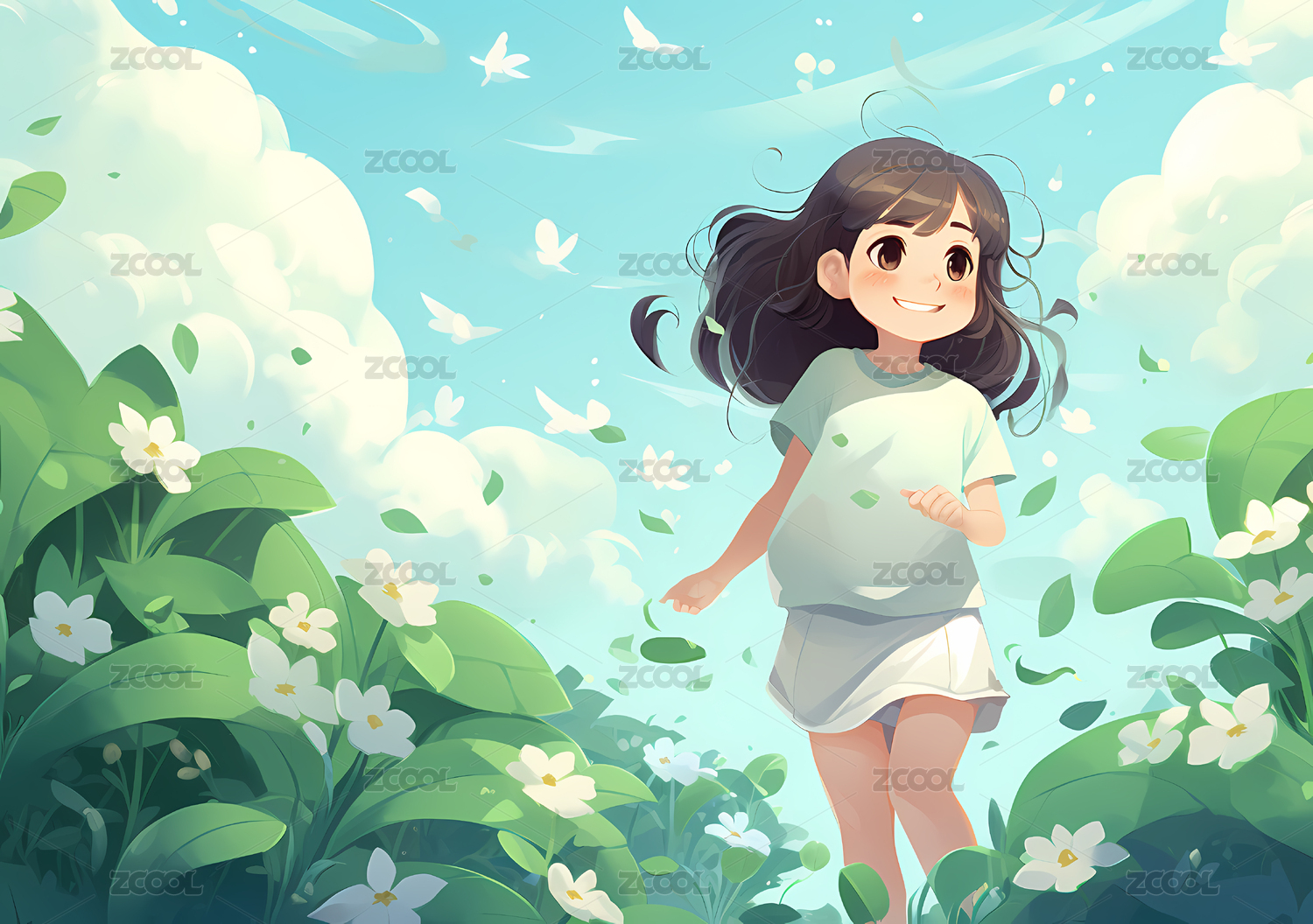 天空草地上的小女孩