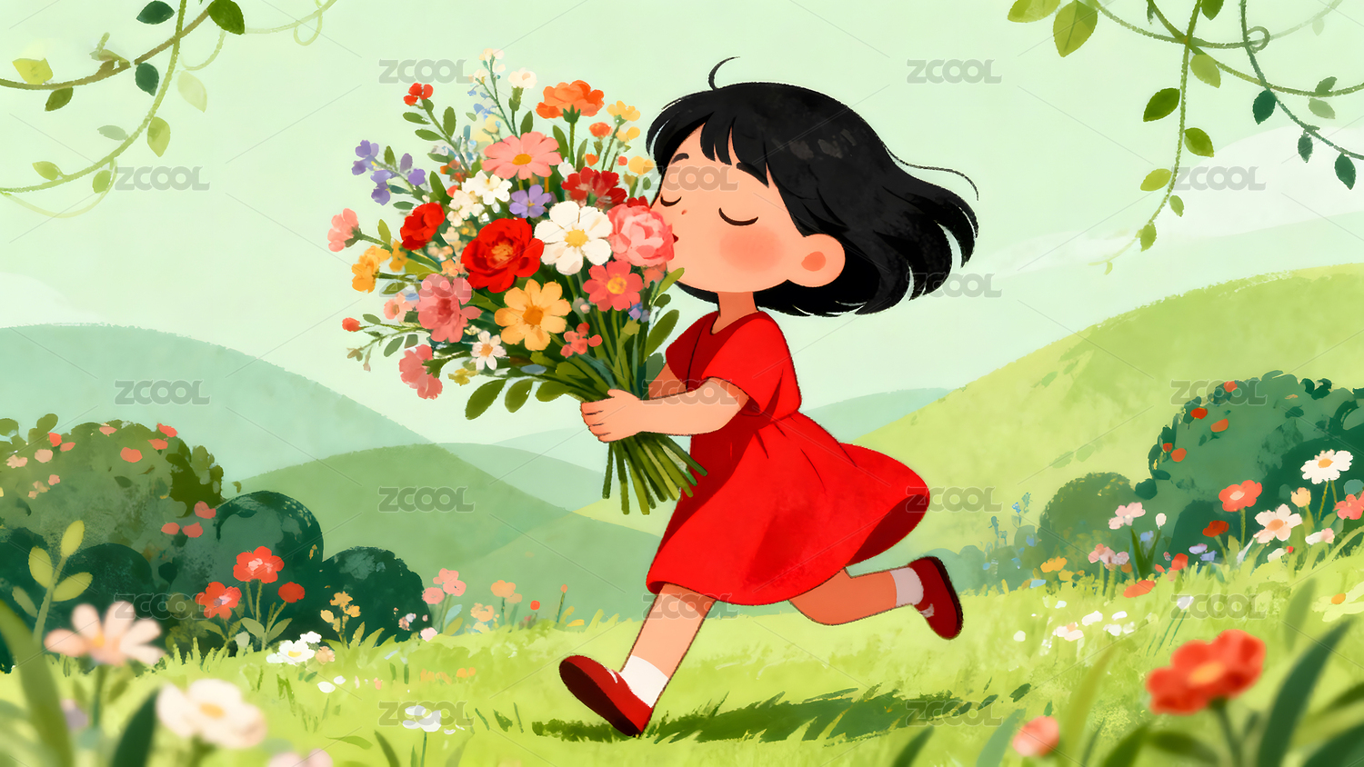 女孩拥抱鲜花奔跑