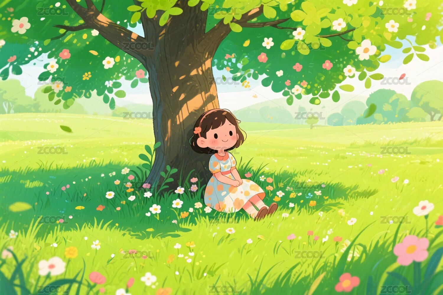 女孩在大树下的插画