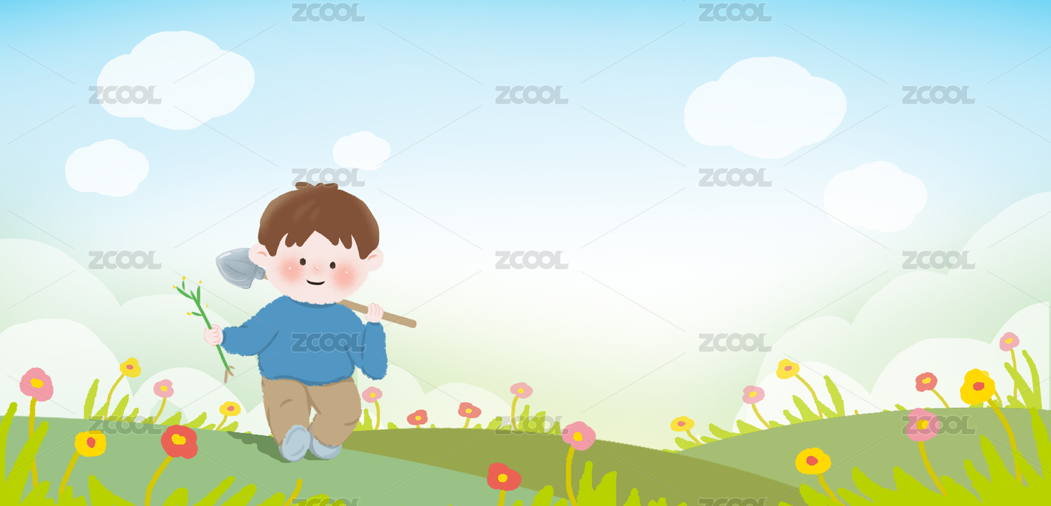 拿着树苗扛着铁锹的男孩 植树节插画