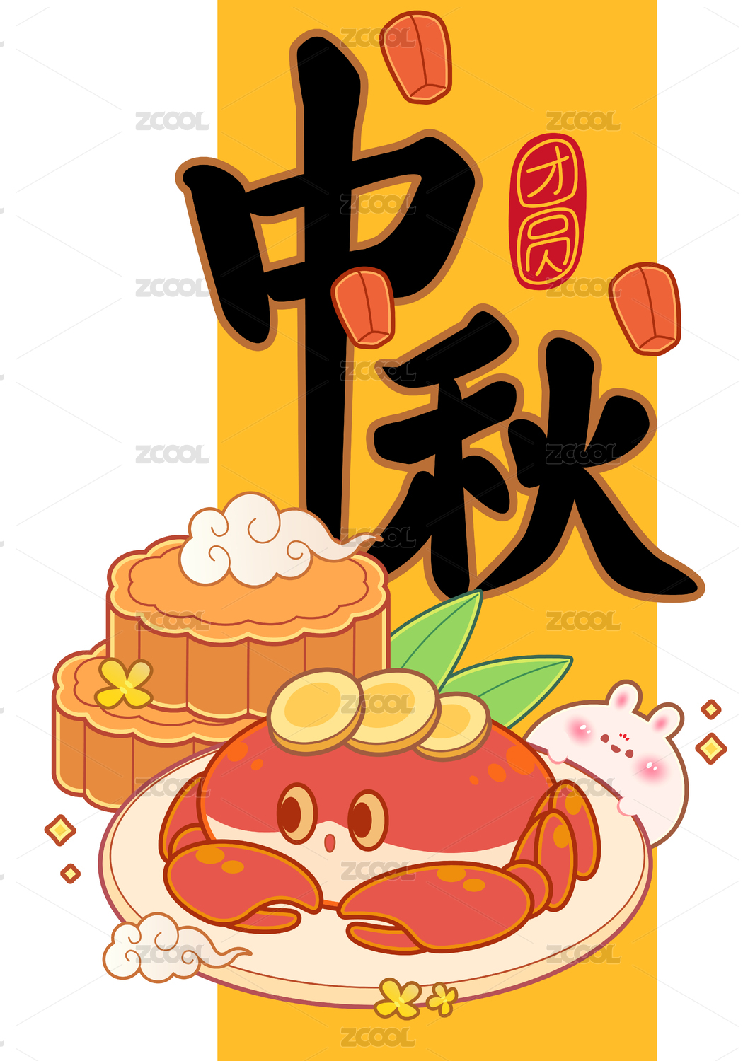 中秋节玉兔和月饼 国画风格插画