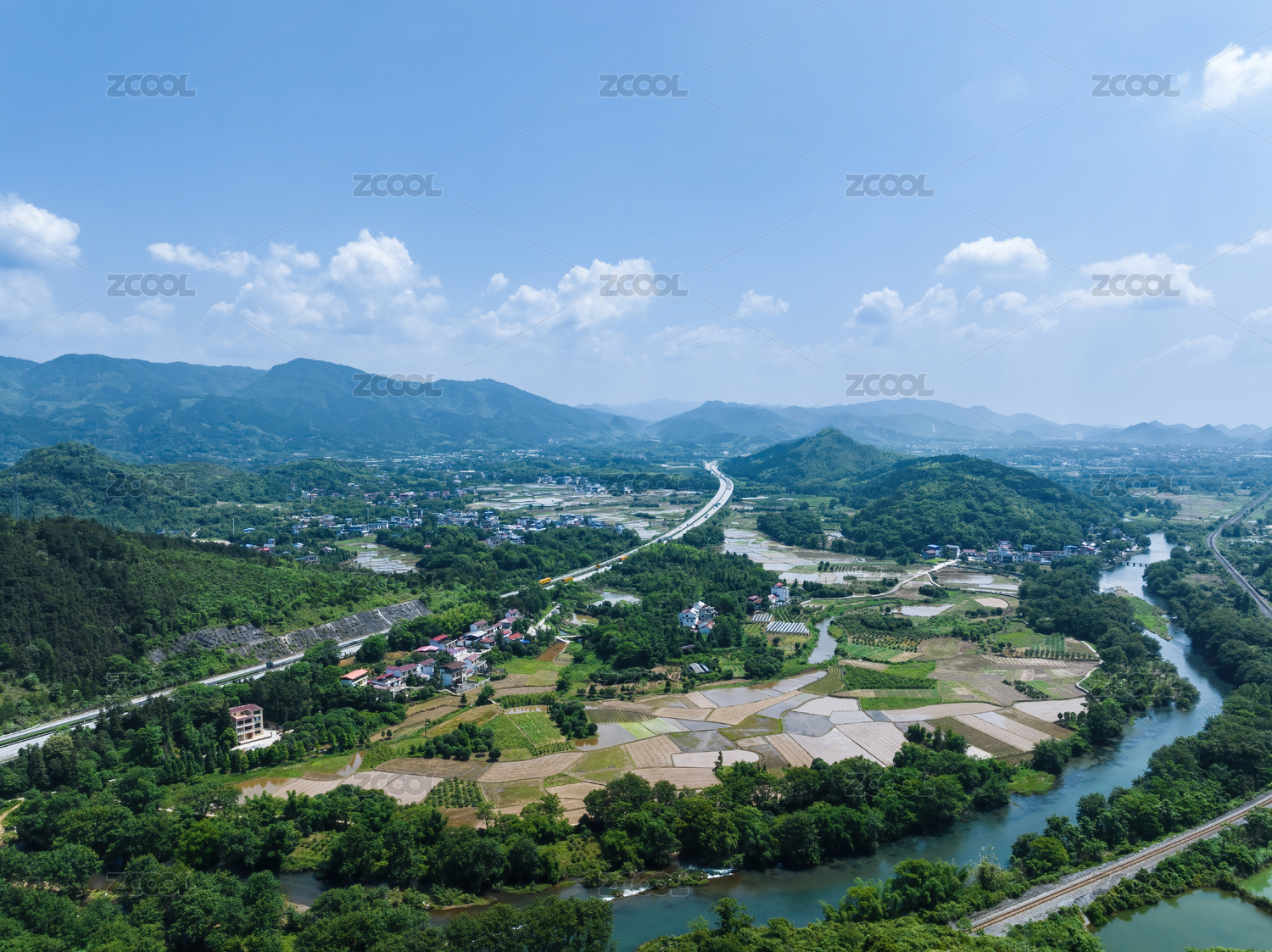 阳光下桂林山间高速公路旁的田园风光