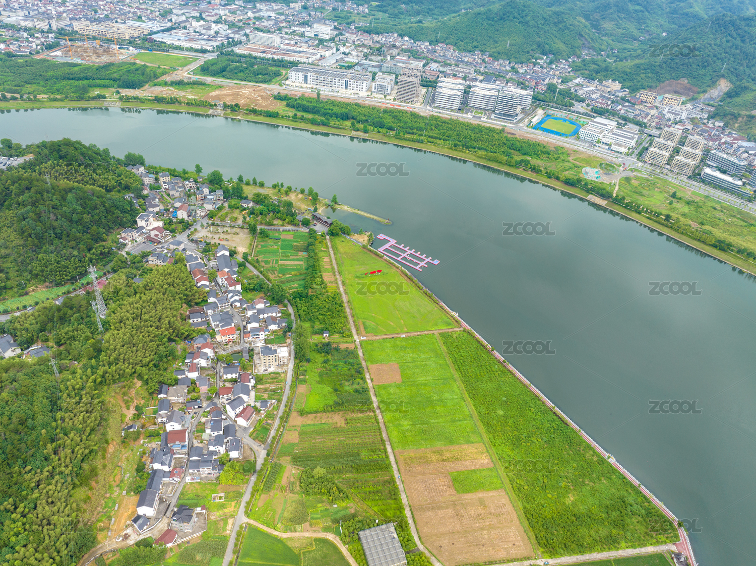 航拍阳光下小河流经的小城镇景观