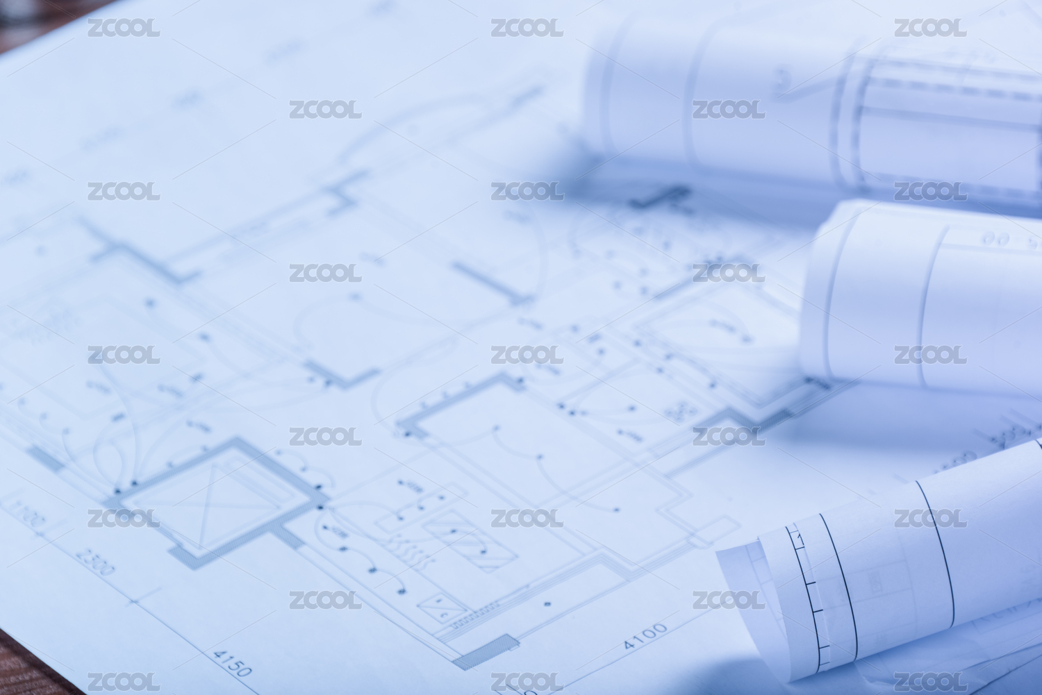 俯视拍摄满桌子的建筑图纸和工作中的设计师