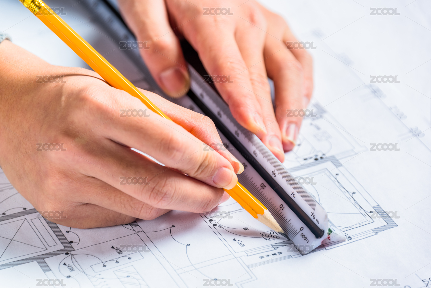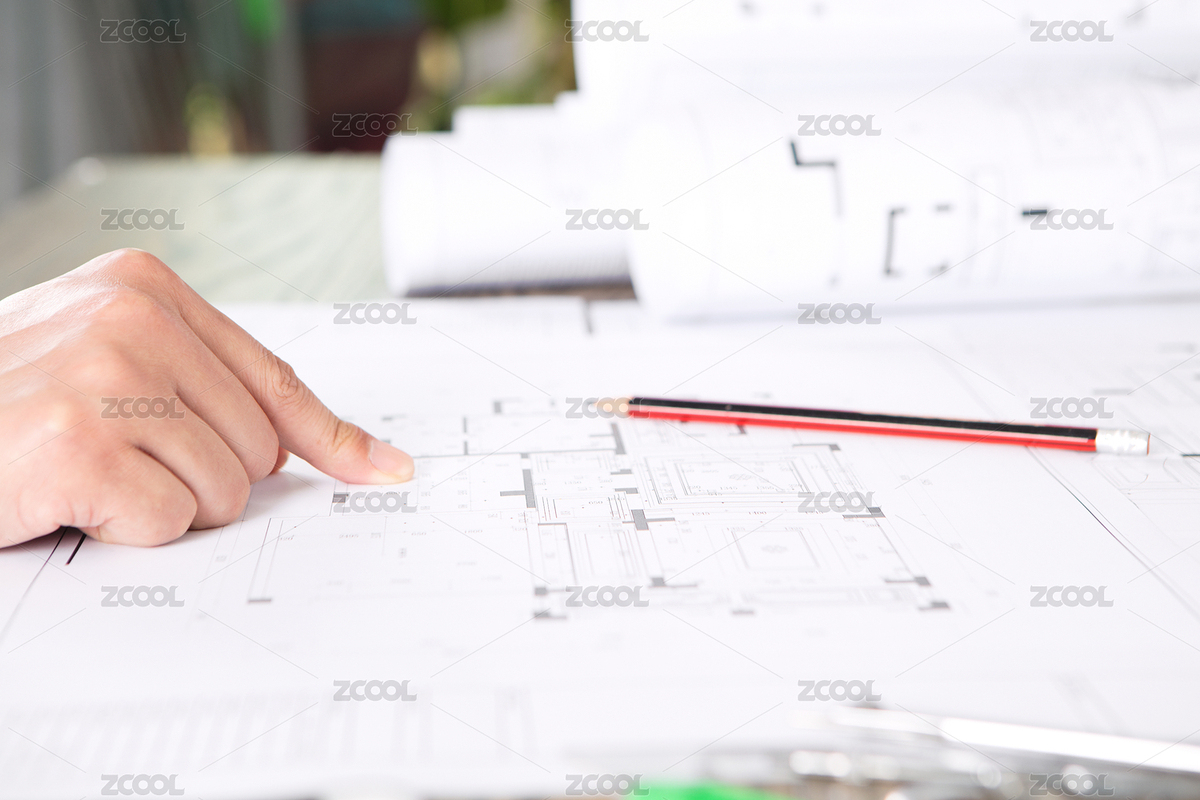 一只手指着建筑图纸上的细节及旁边一些相关修改工具