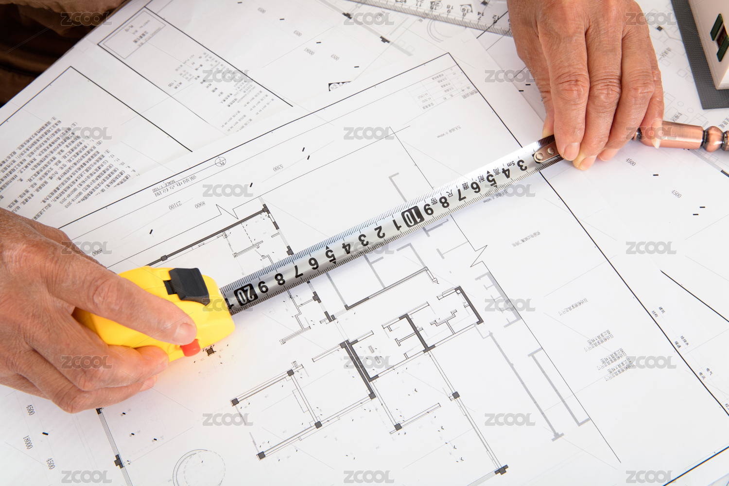 俯视拍摄建筑设计师使用卷尺测量图纸的精度