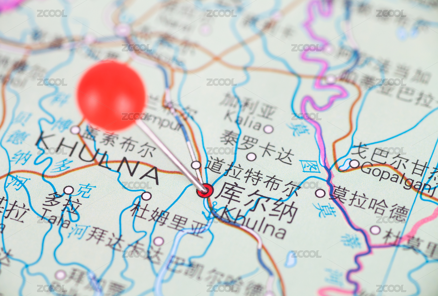地图上被大头钉标注的孟加拉国城市库尔纳
