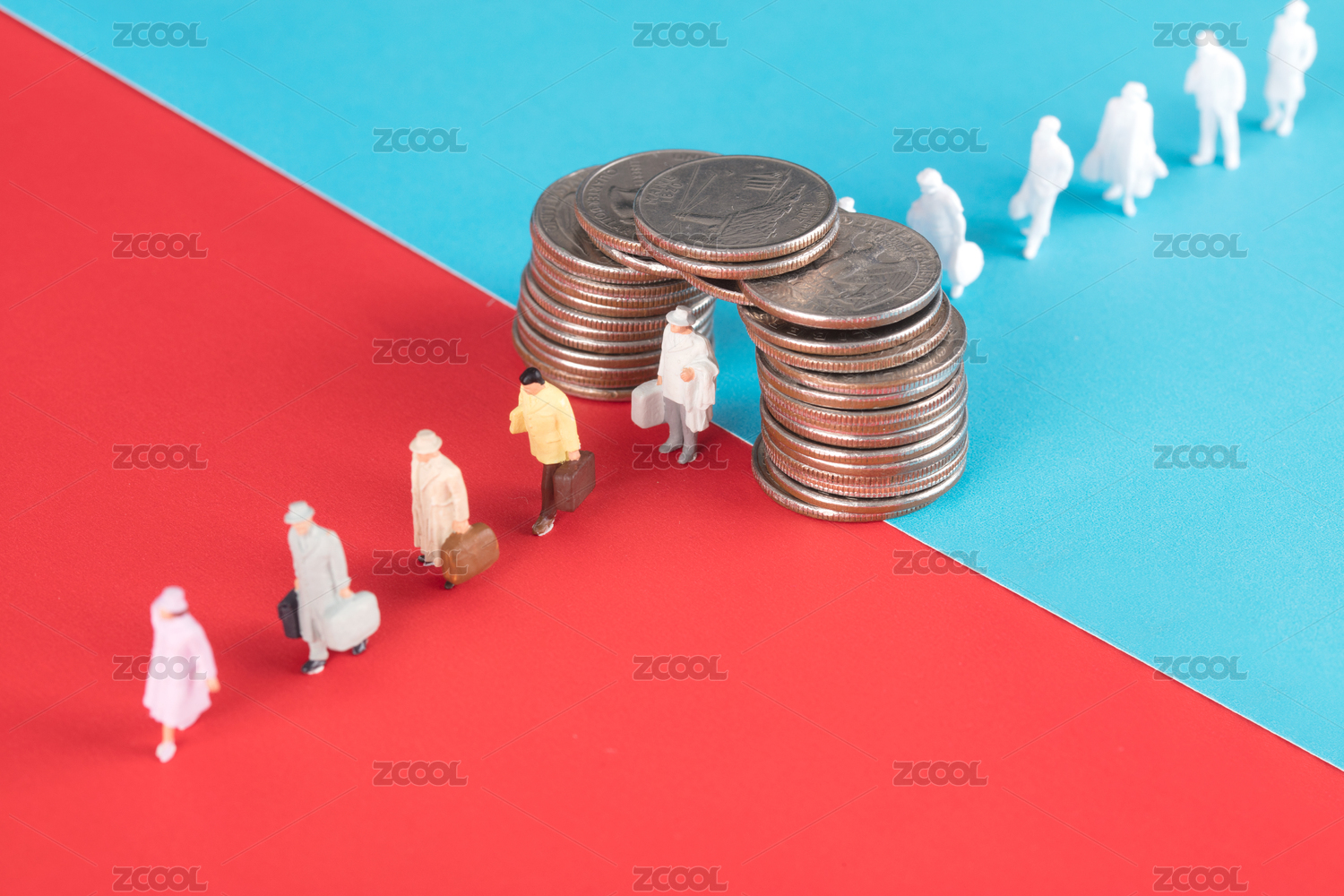 不同数量的硬币和上面的人物模型概念