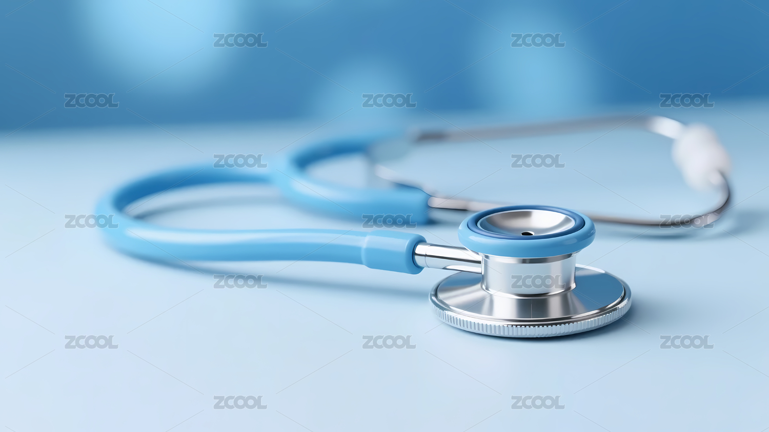 蓝色听诊器静置于浅蓝背景之上