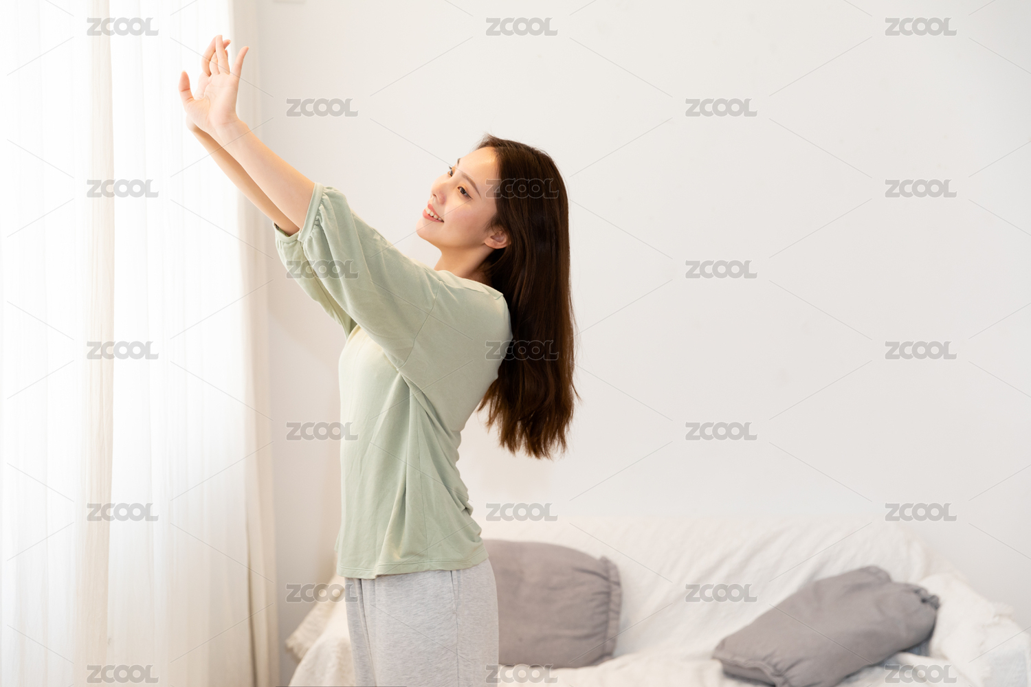一名年轻女性在家里的客厅坐上沙发上伸懒腰拉伸