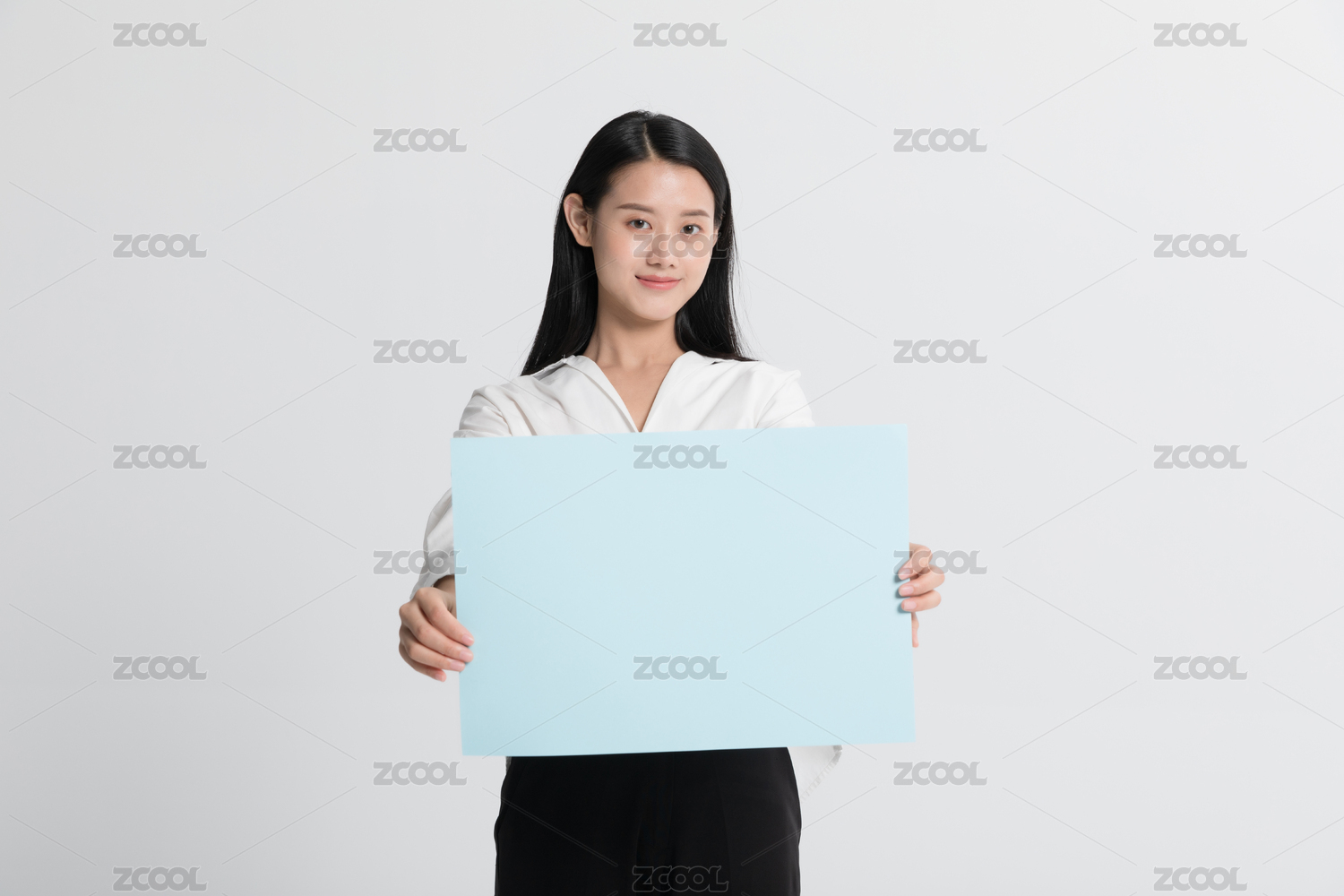 穿白衬衣的女生拿着空白蓝色卡纸展示