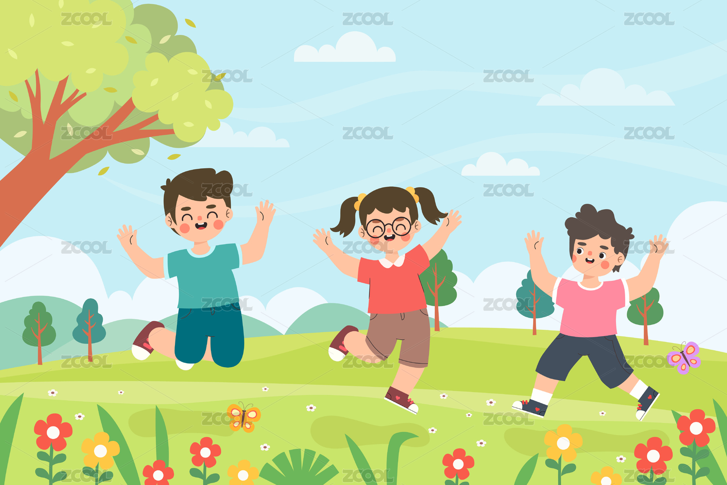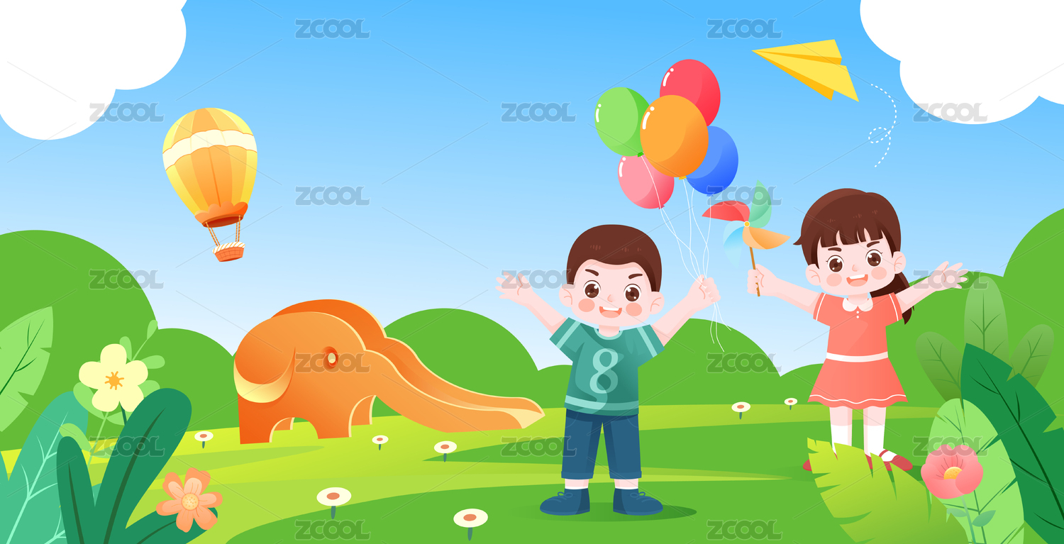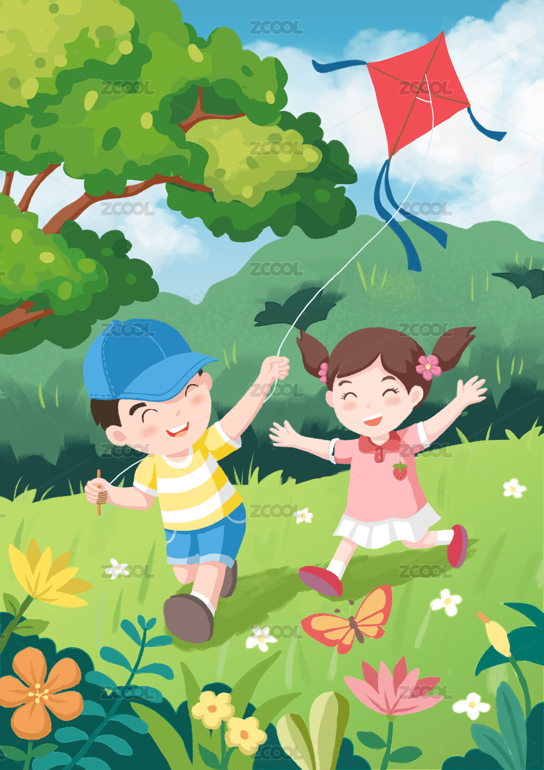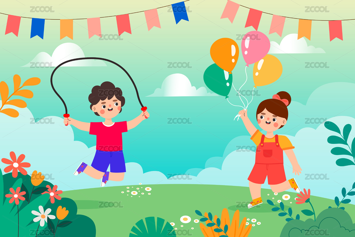六一儿童节小孩户外玩耍夏天暑假娱乐插画