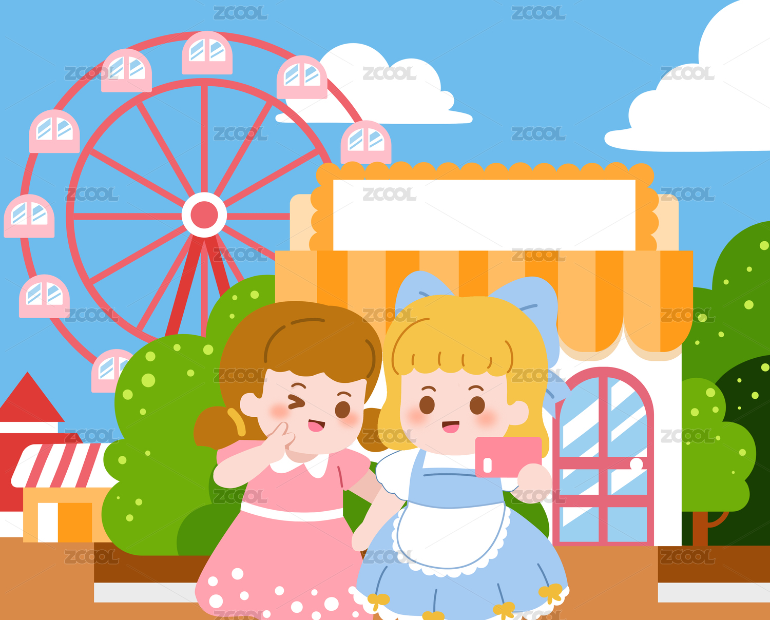 六一儿童节游乐园摩天轮旋转木马树林插画
