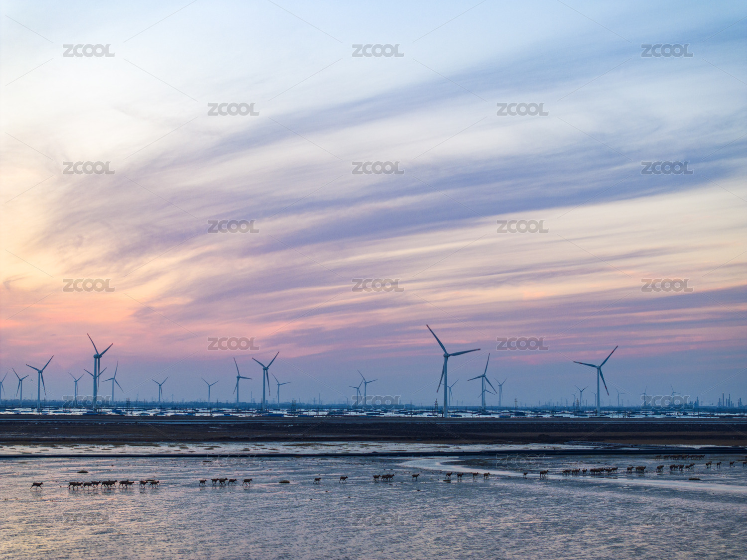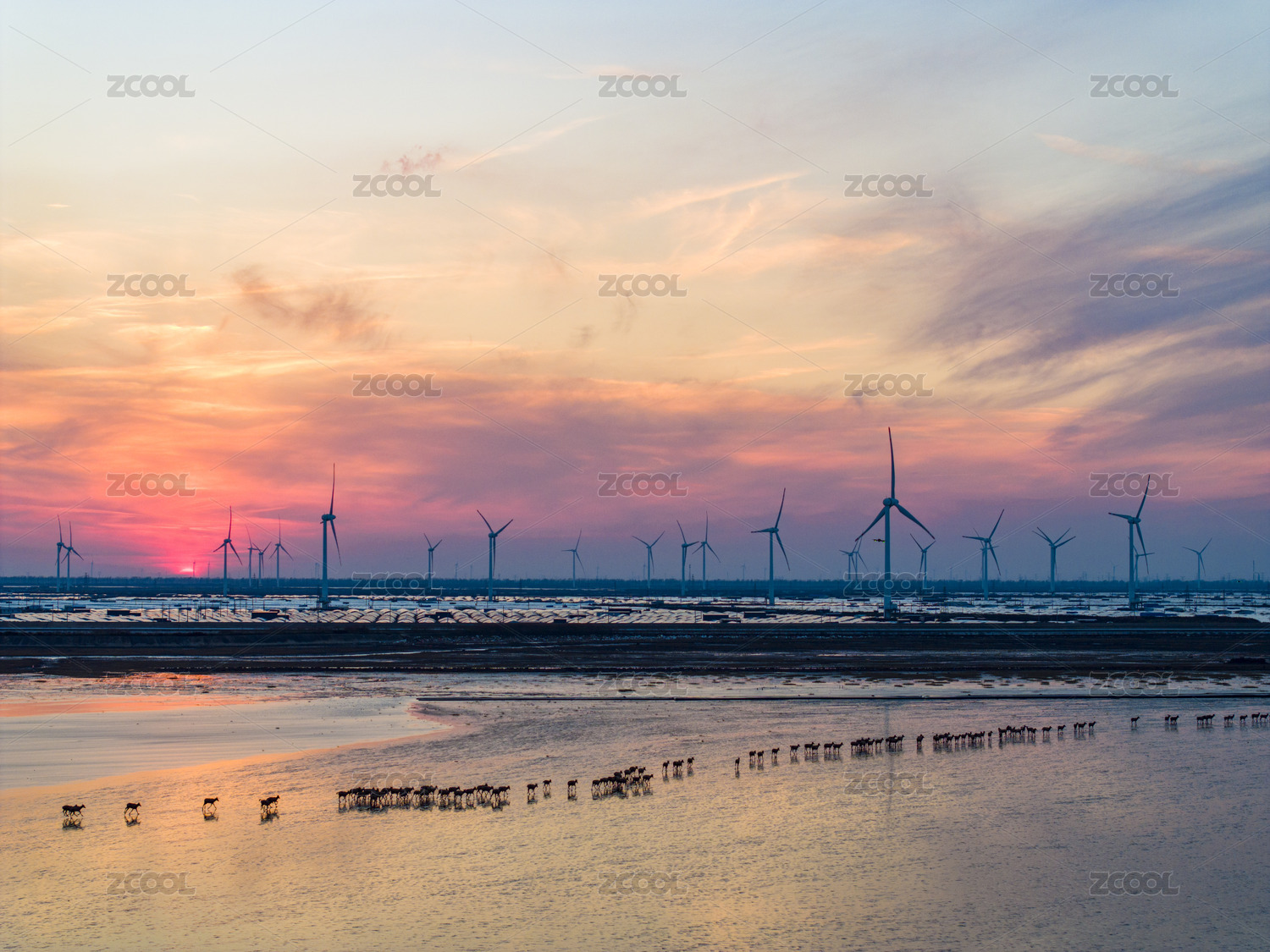 中国江苏如东黄海滩涂上的风力发电机