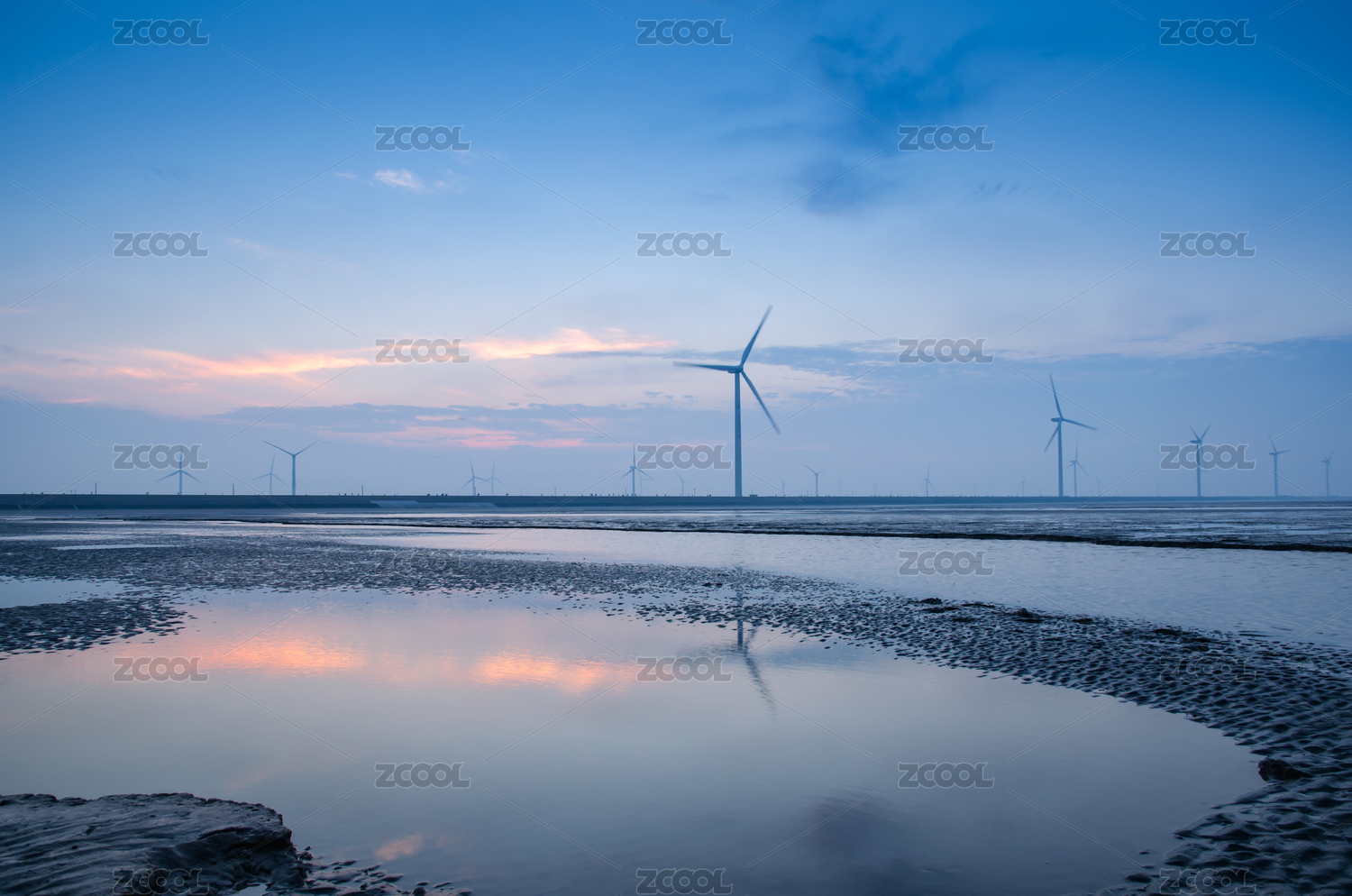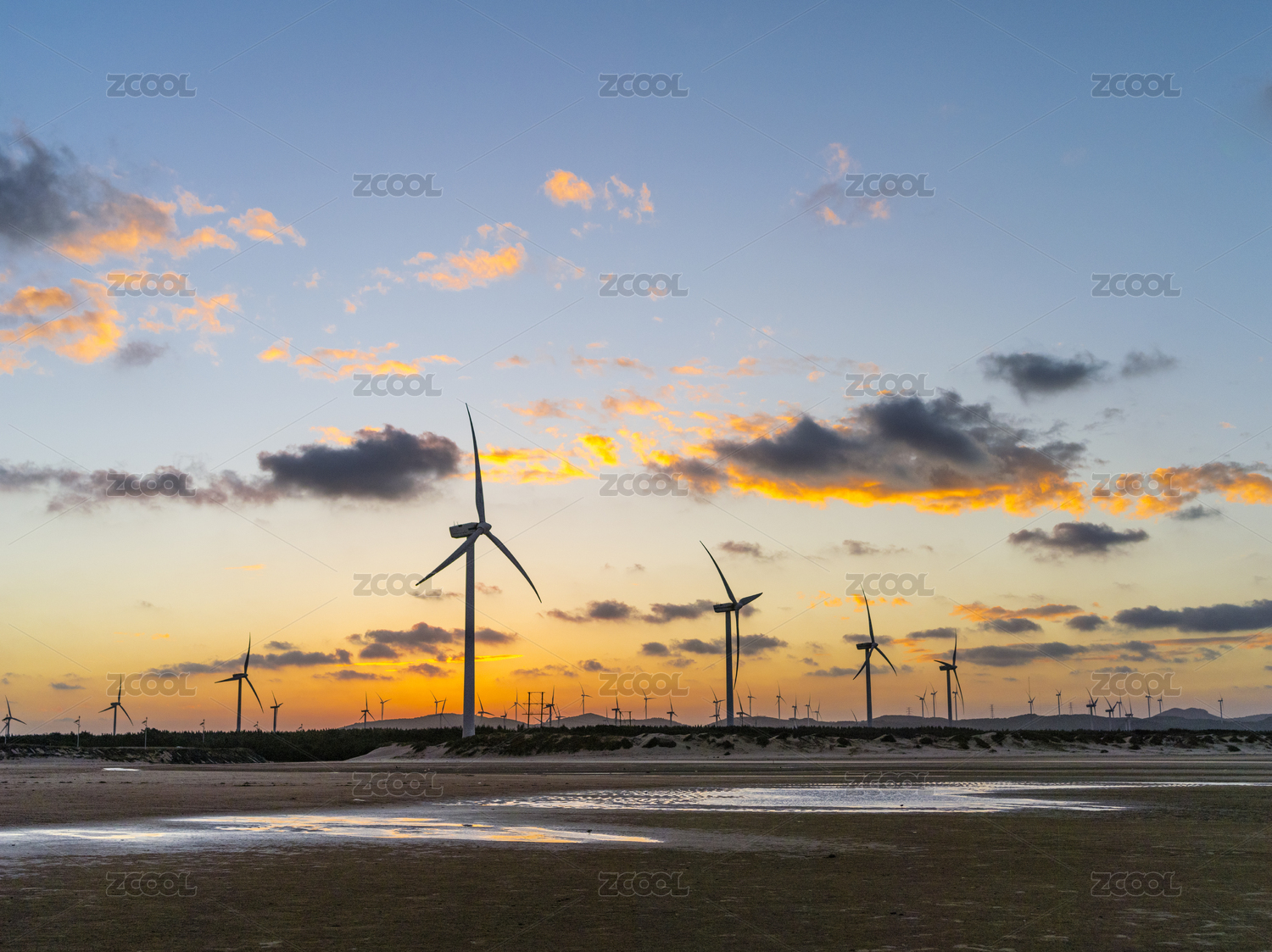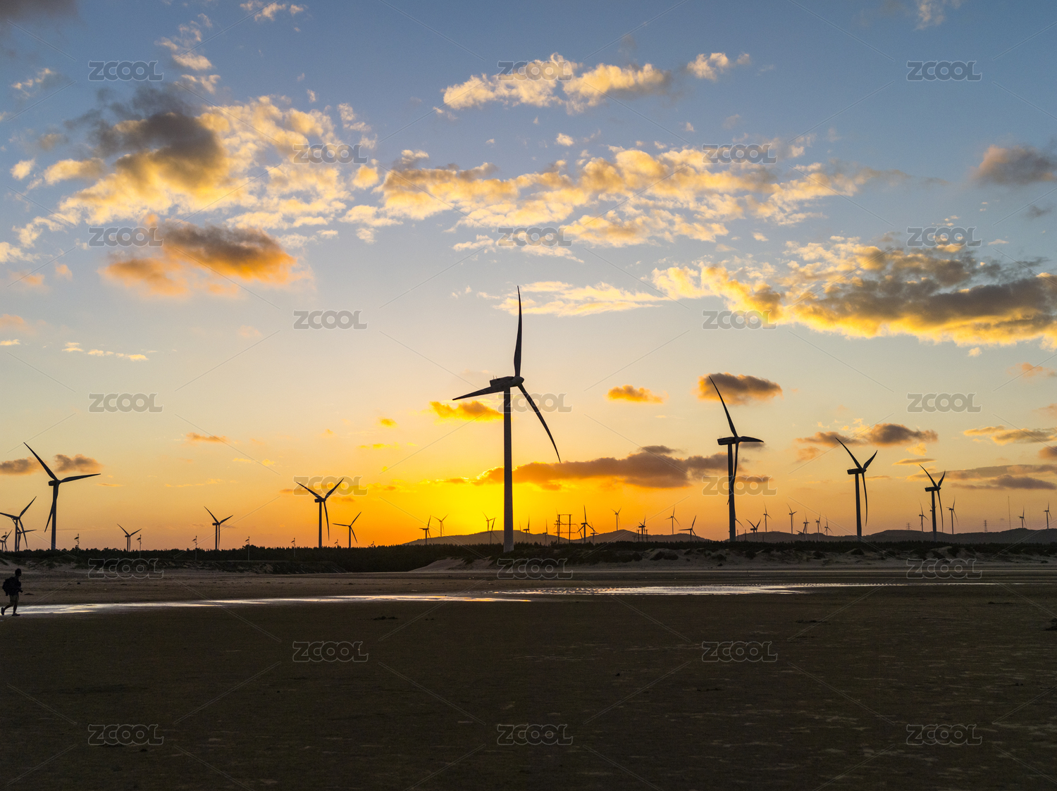 沙滩上夕阳照射下的风力发电机组