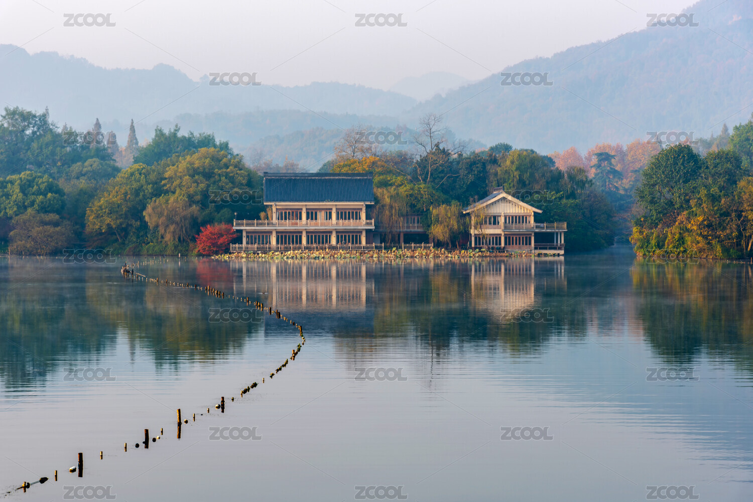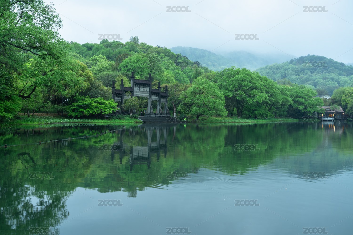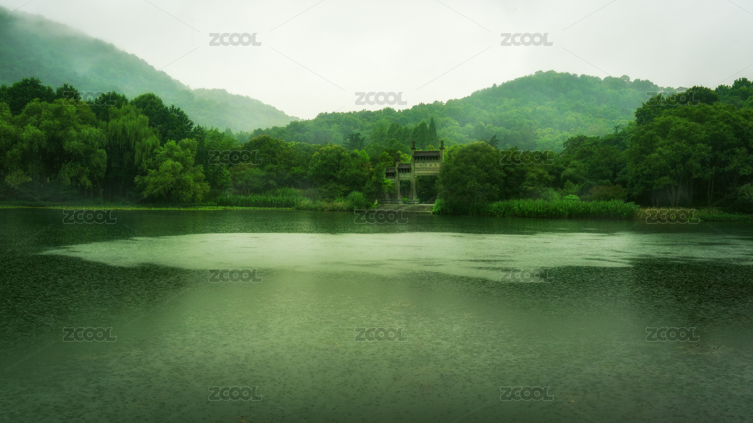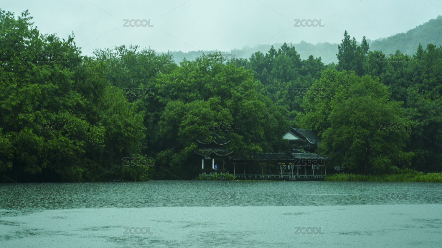 江南杭州西湖浴鹄湾春天春雨阴雨天自然建筑