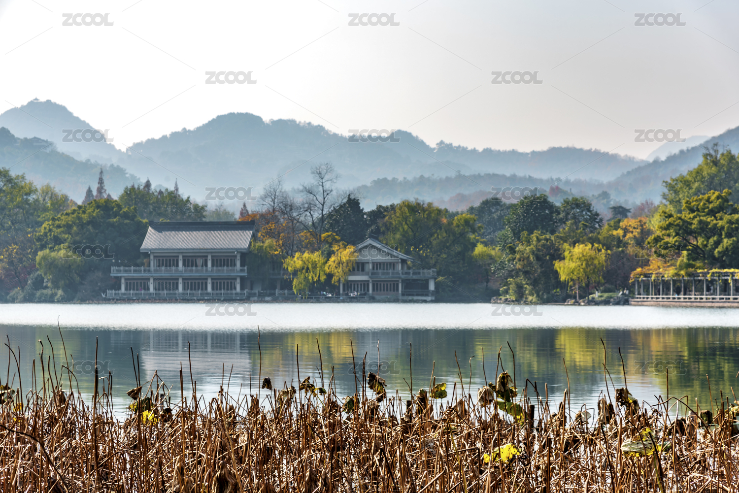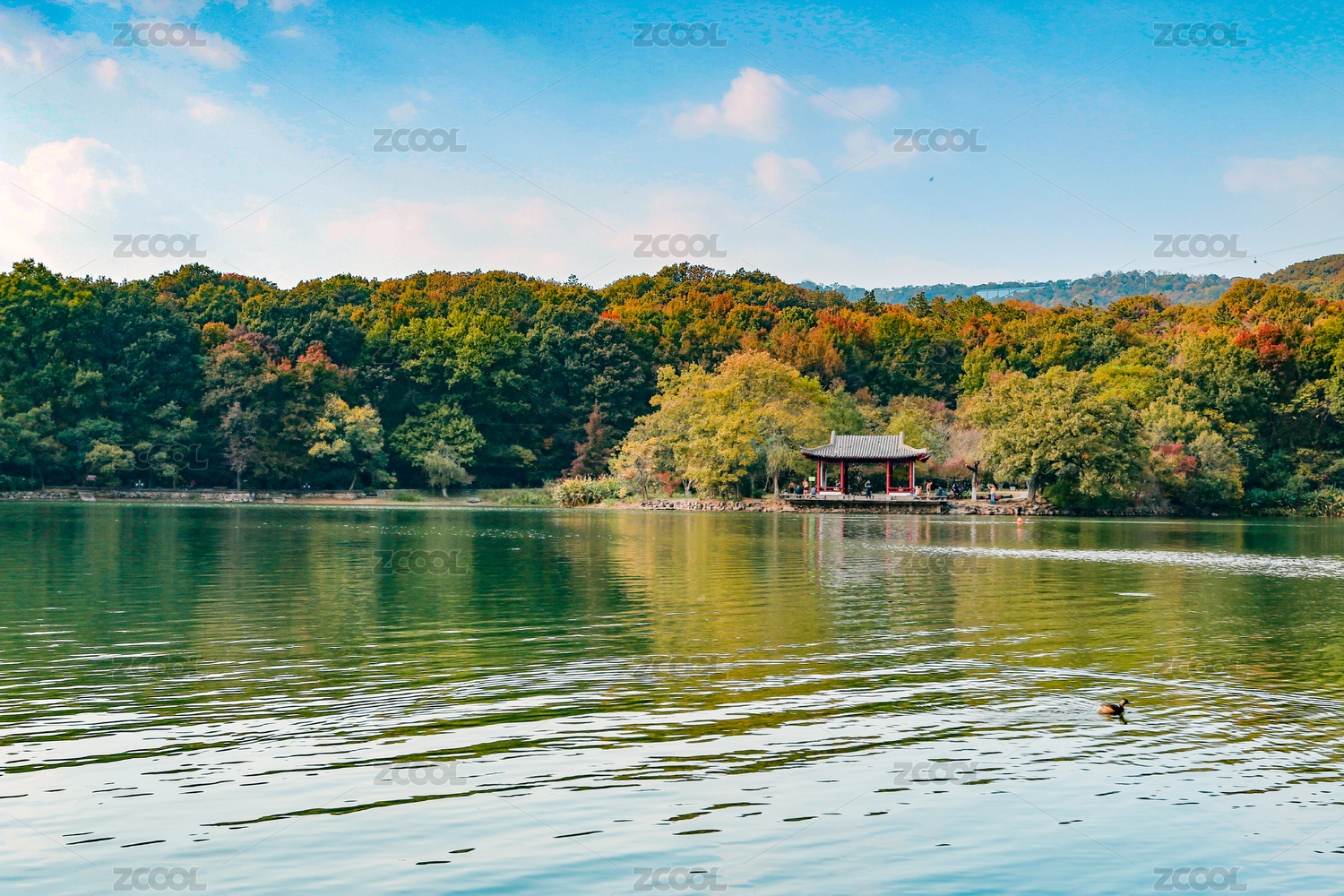 中国浙江杭州西湖秋景绿水芙蕖亭
