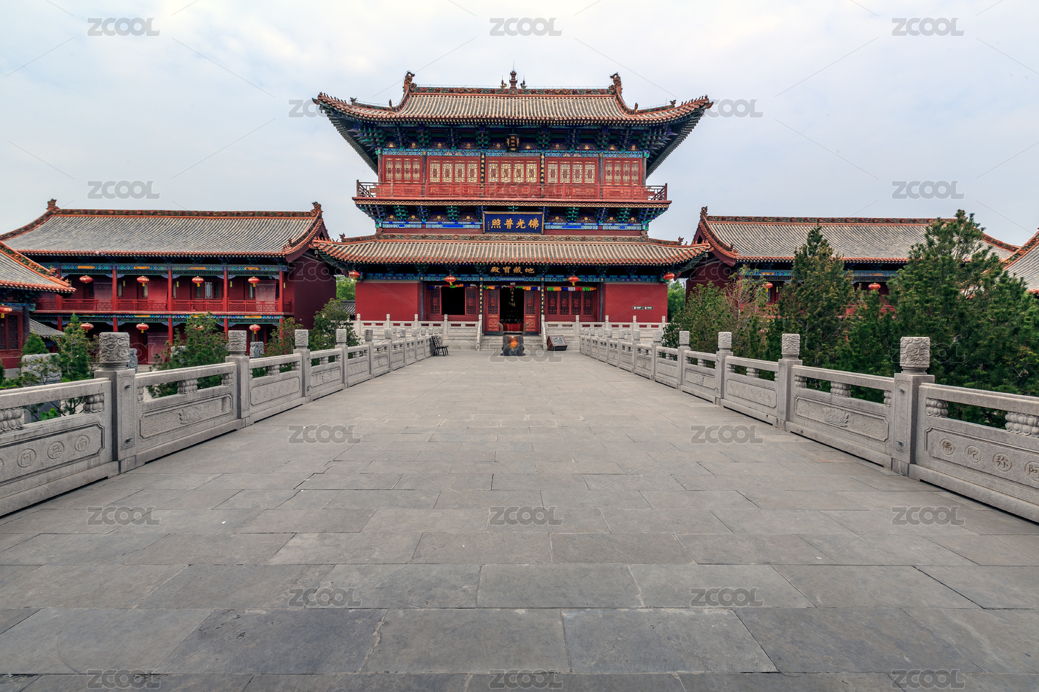 中国山东省寿光市林海生态博览园宁国寺石拱桥后的殿宇式建筑