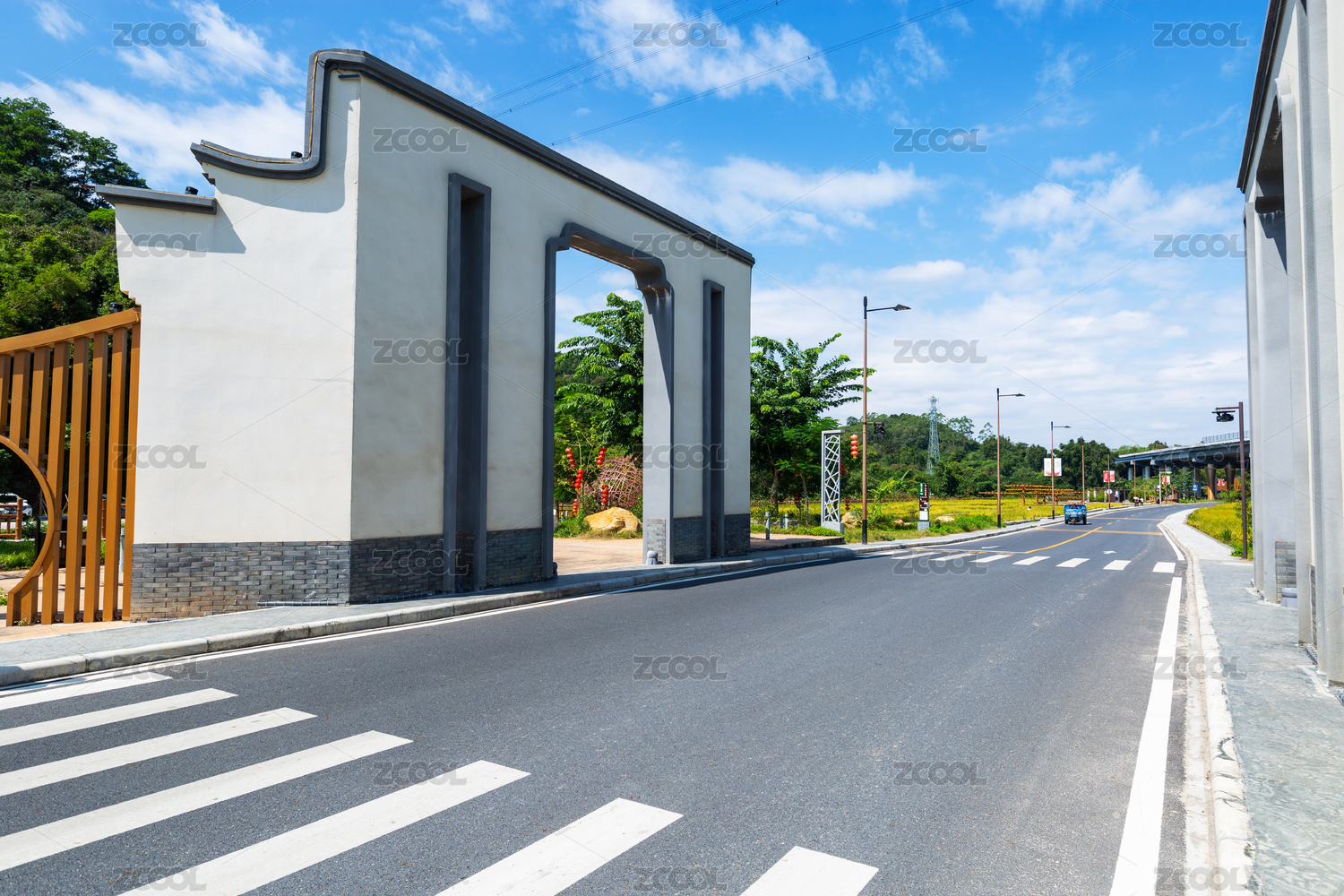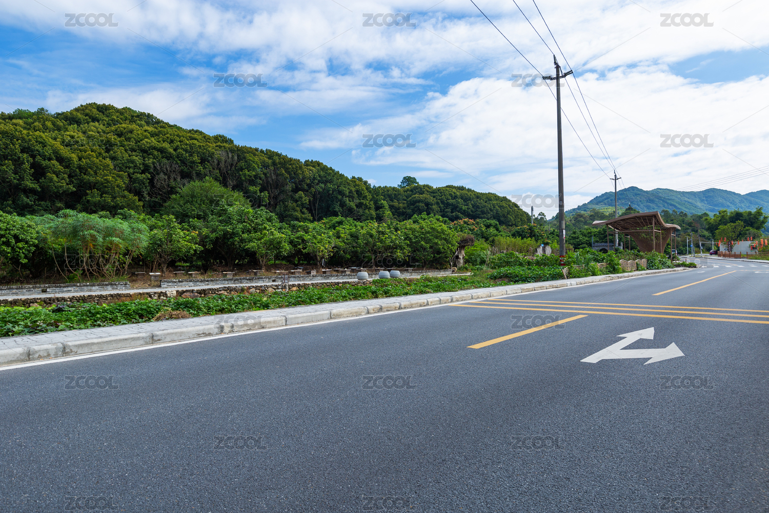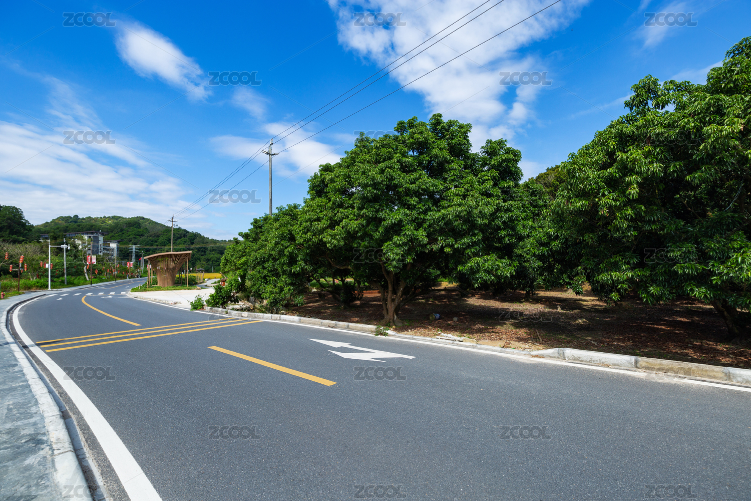 蓝天白云下的公路亚热带地区公路边的植物
