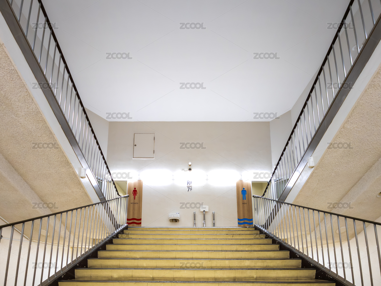 现代建筑室内对称楼梯与公共洗手间指示牌