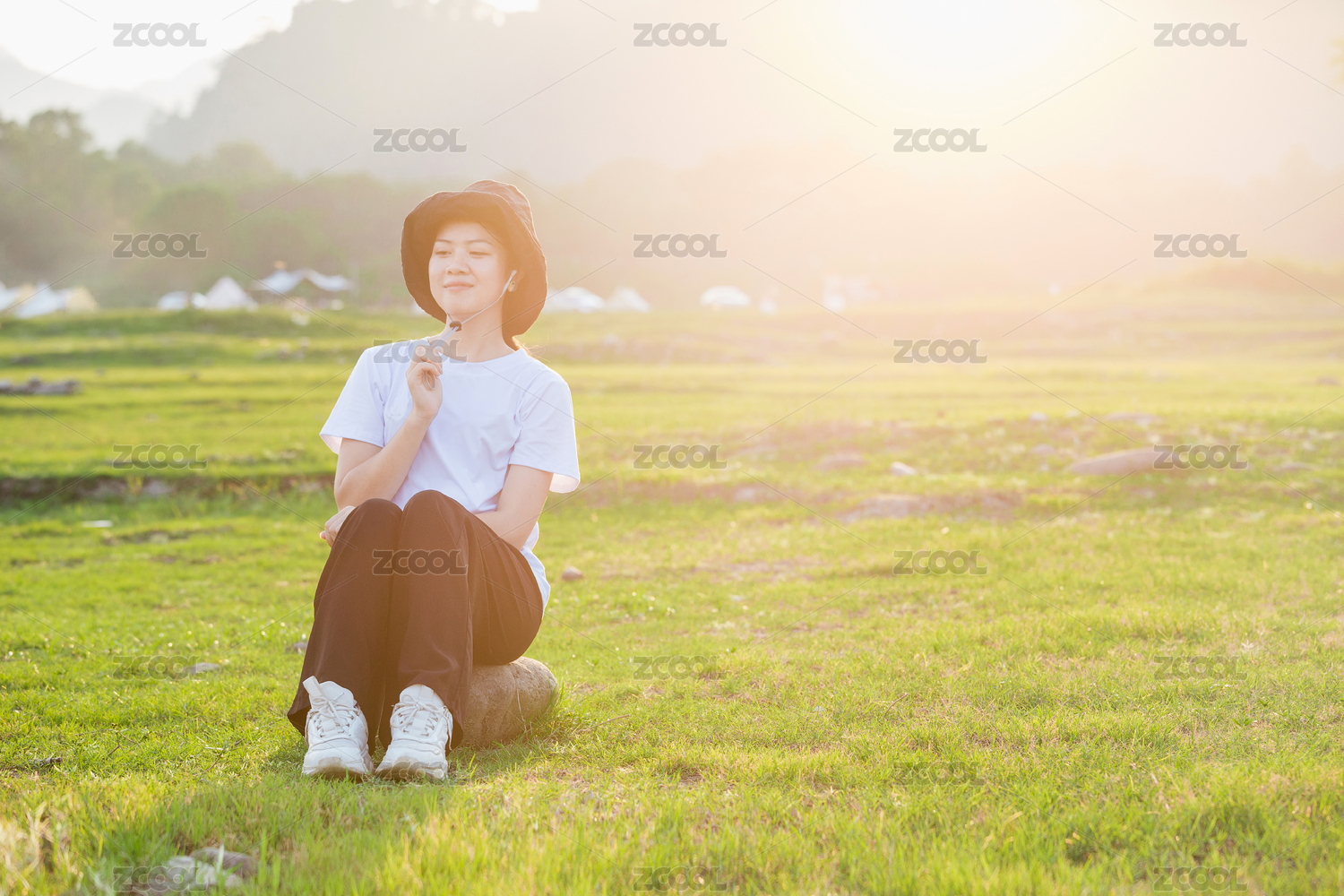 户外露营草坪上静坐的女生