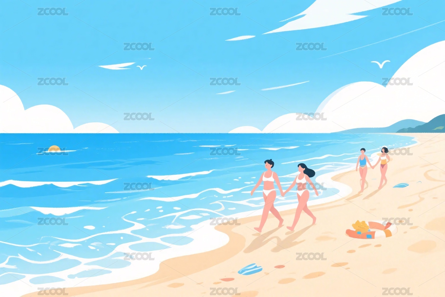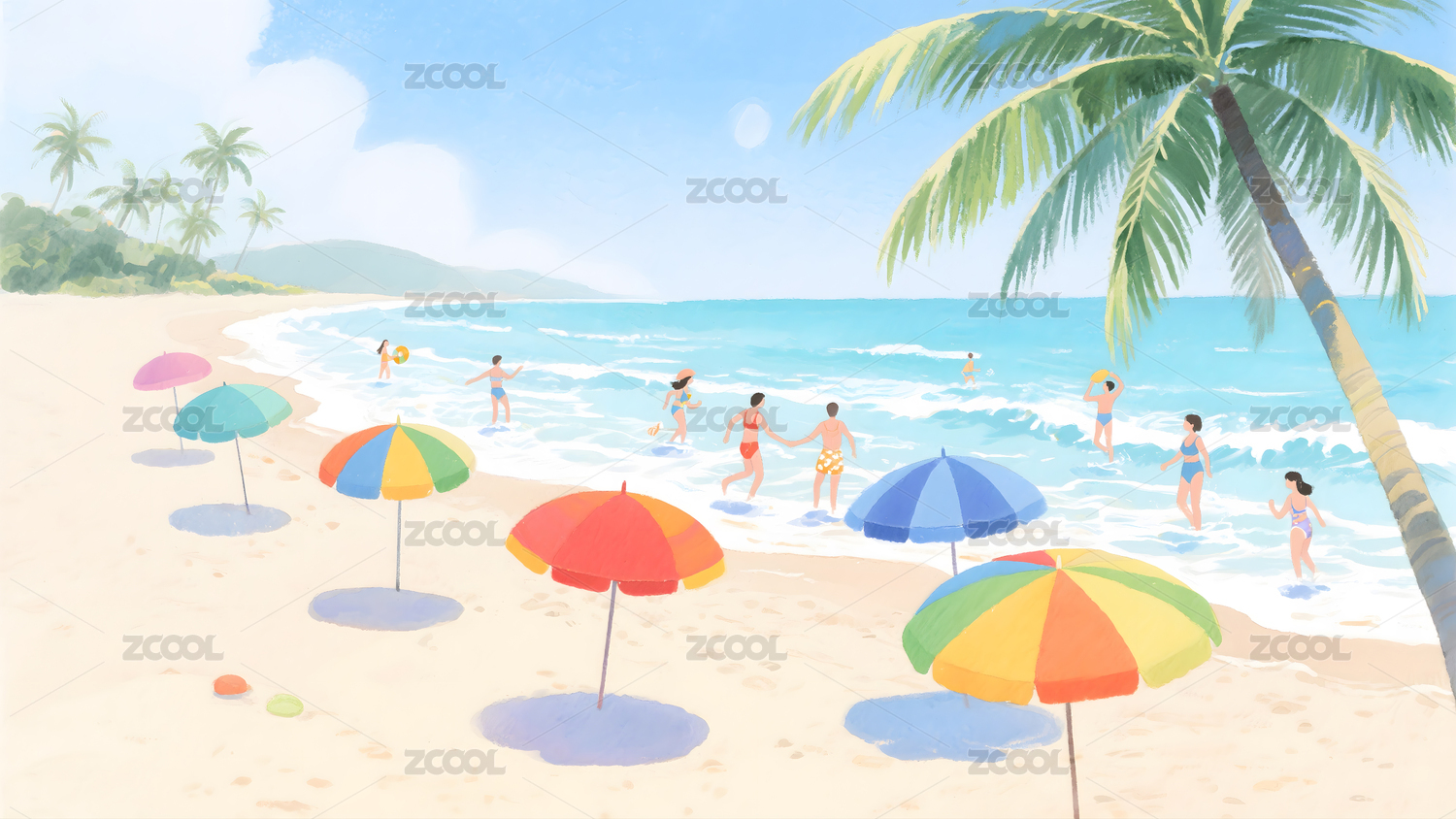 海边沙滩卡通插画背景壁纸
