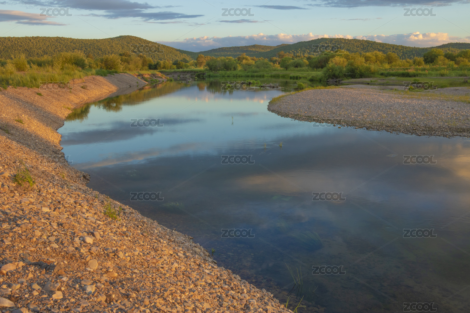 中国大兴安岭湿地的河流、沙滩、植物和云