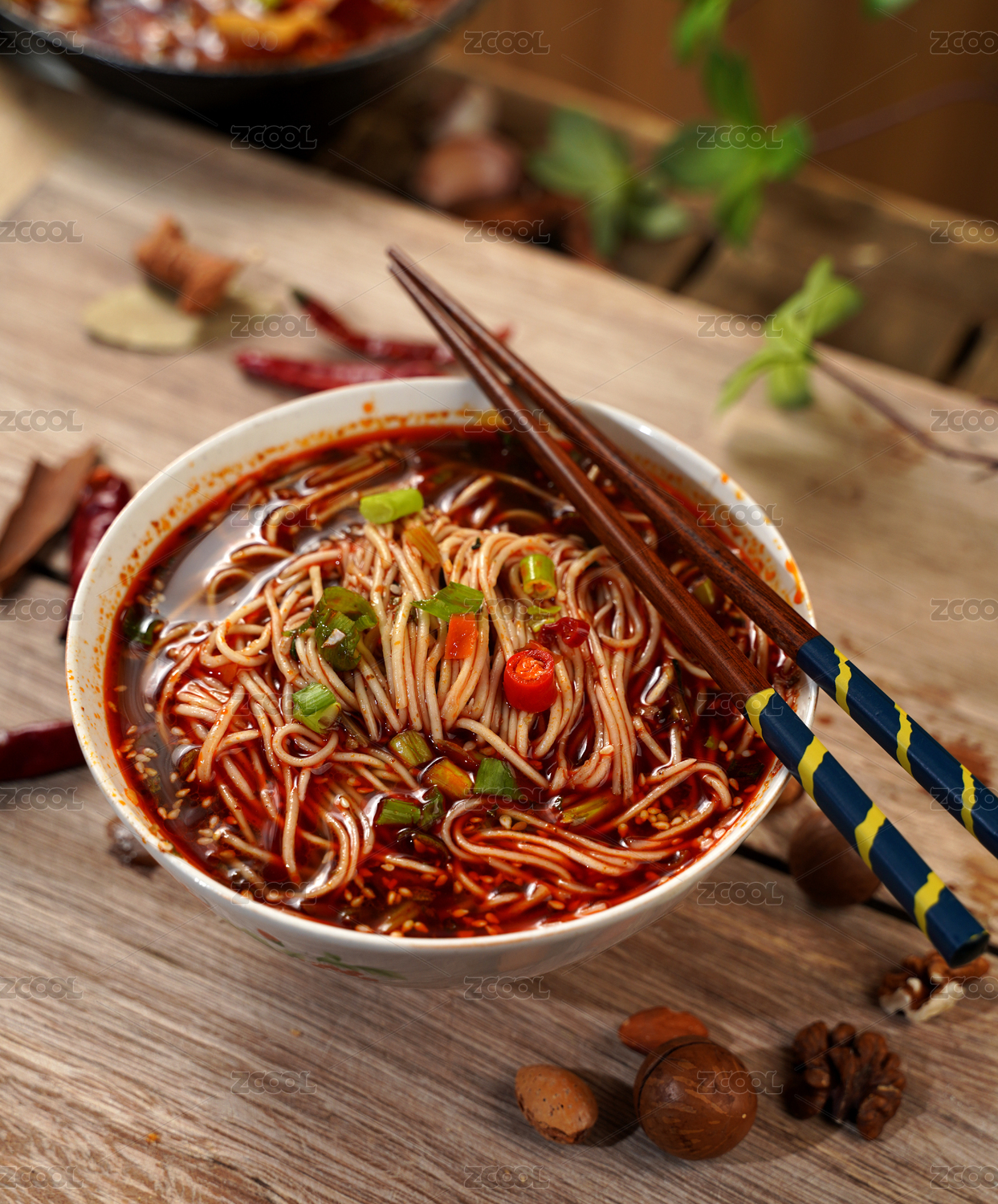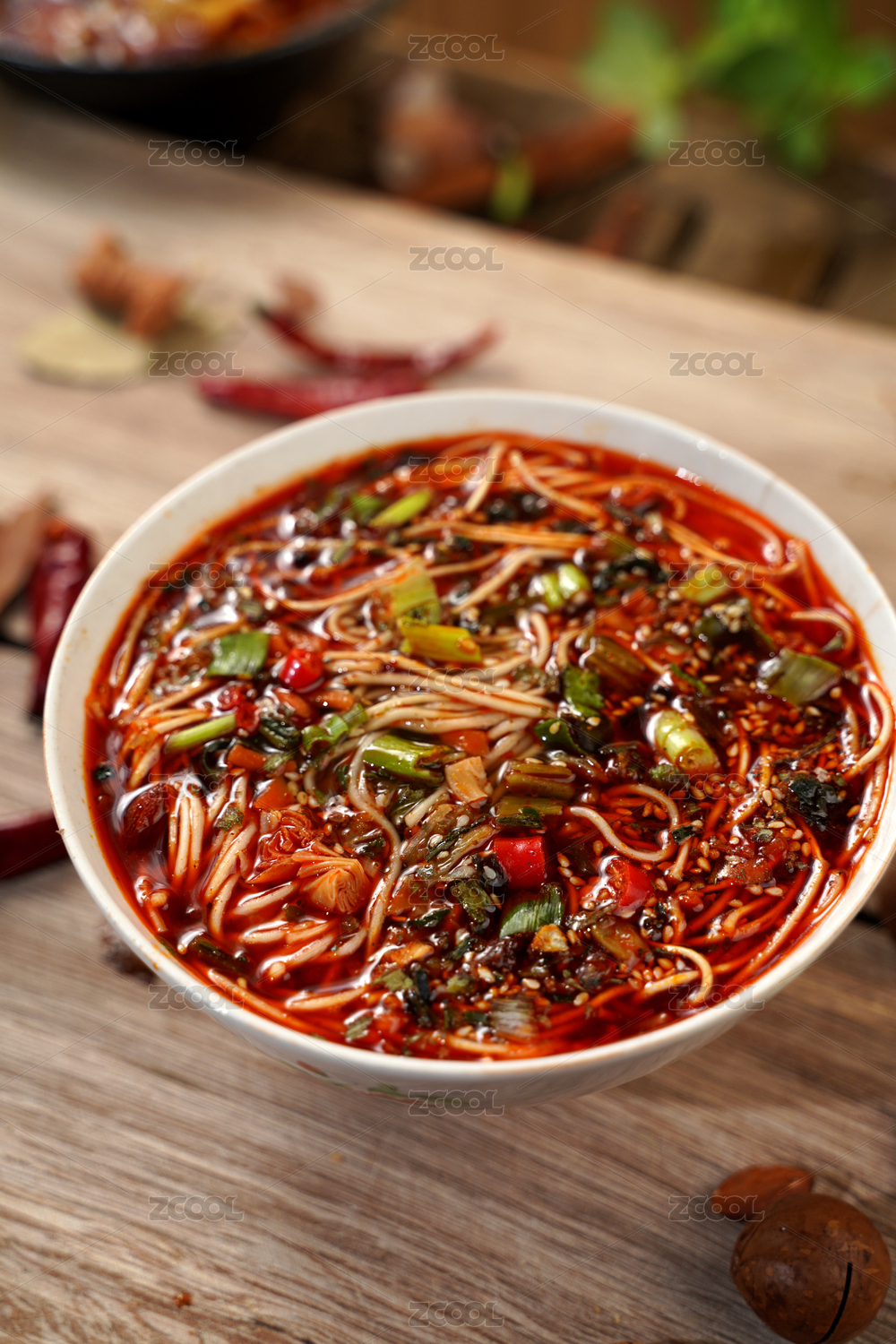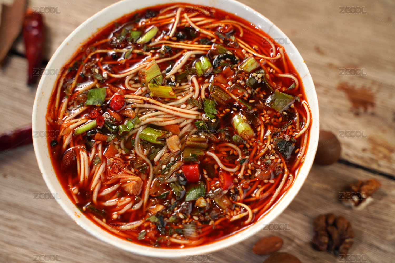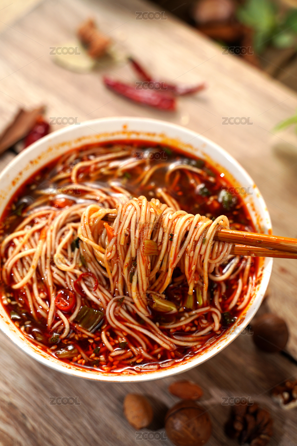 木桌上一碗香辣的重庆小面
