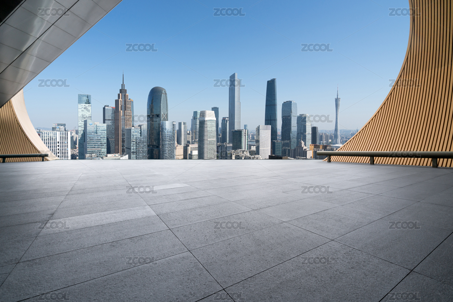 白昼晴天逆光的广州珠江新城天际线道路路面