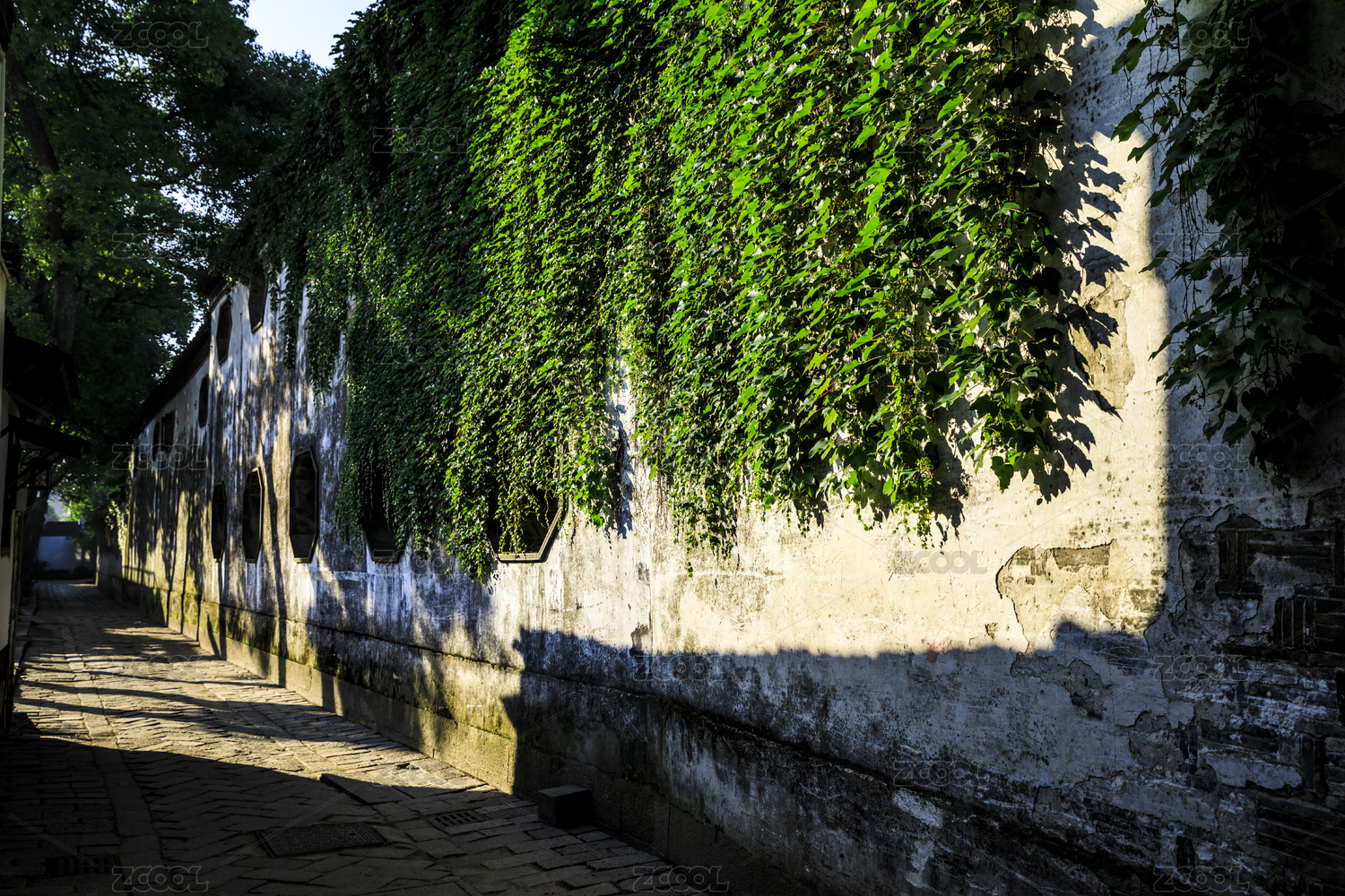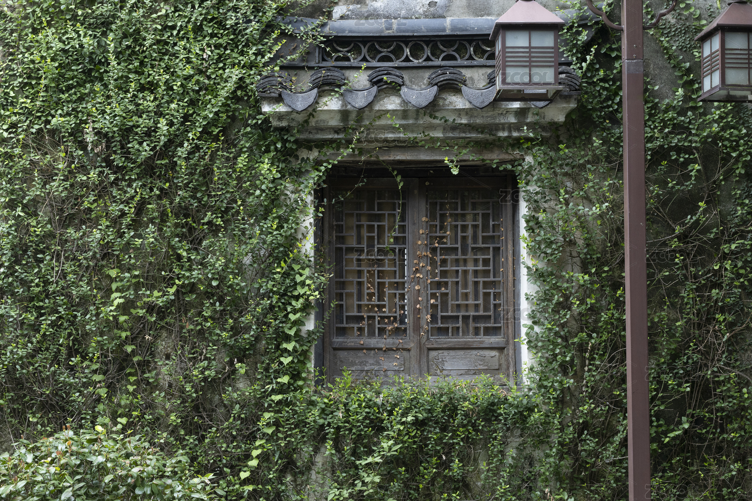 古墙绿意中的窗户