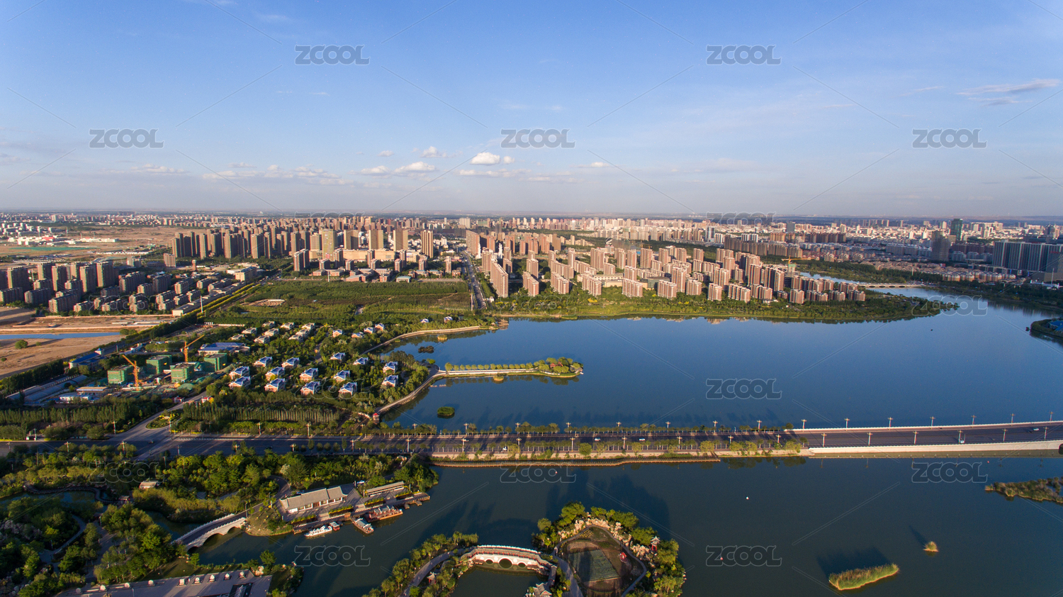 航拍郑州高新区天健湖公园城市湿地湖泊水系
