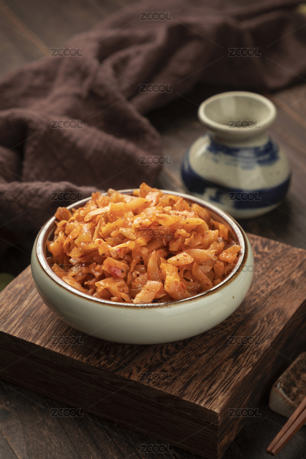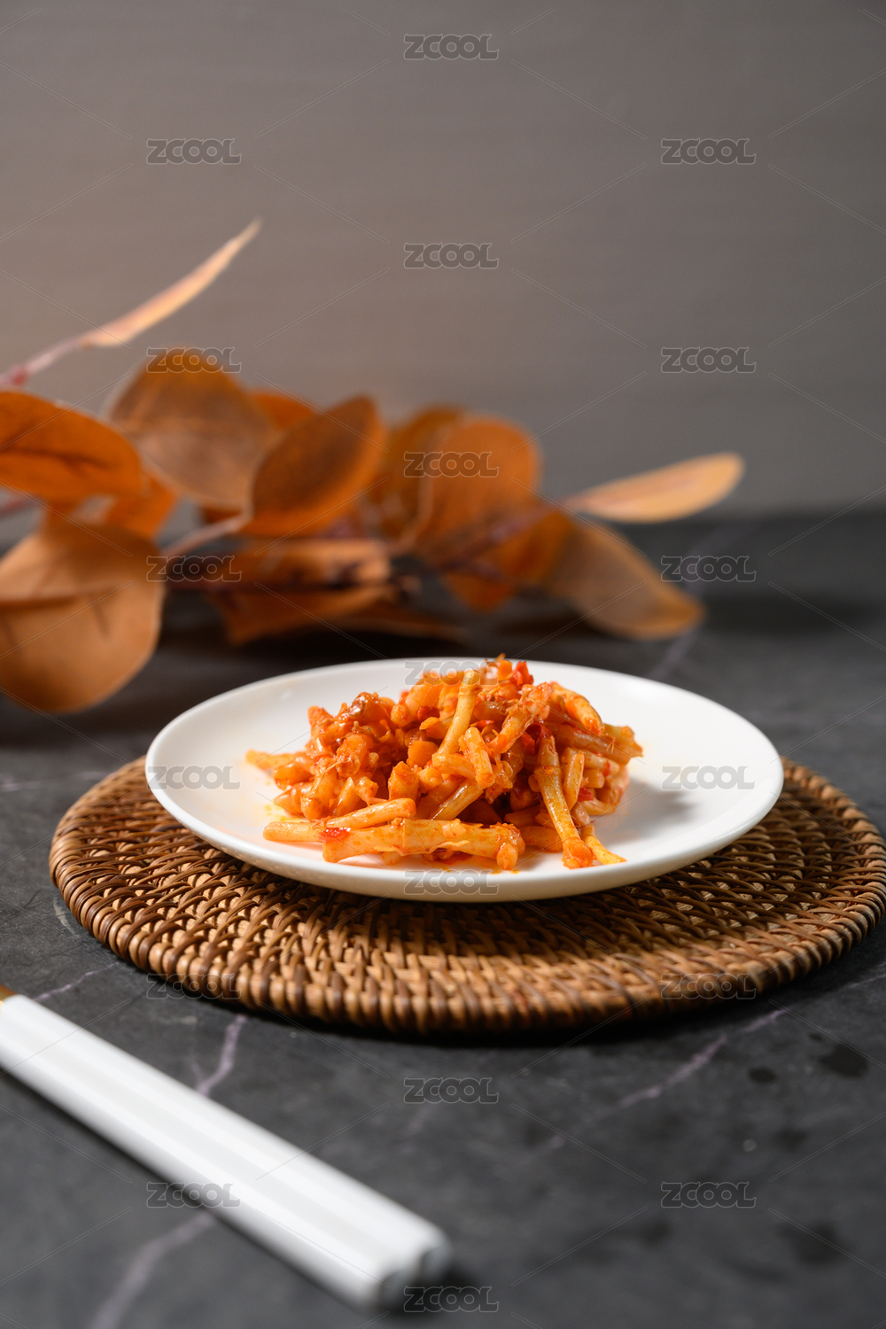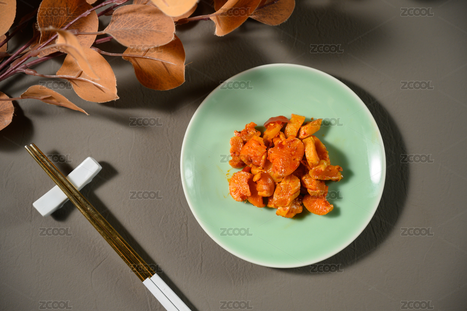 桌面上的盘子里的美味可口的香辣萝卜丁