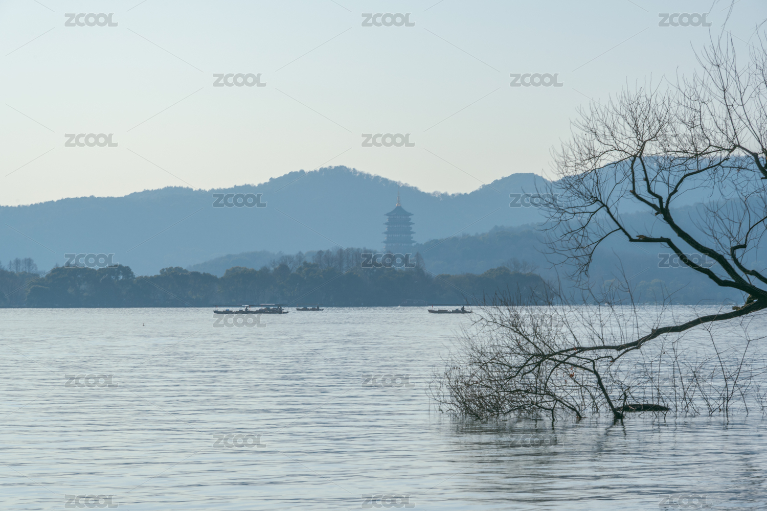 冬天的杭州西湖枯树 平湖 雷峰塔 湖心岛