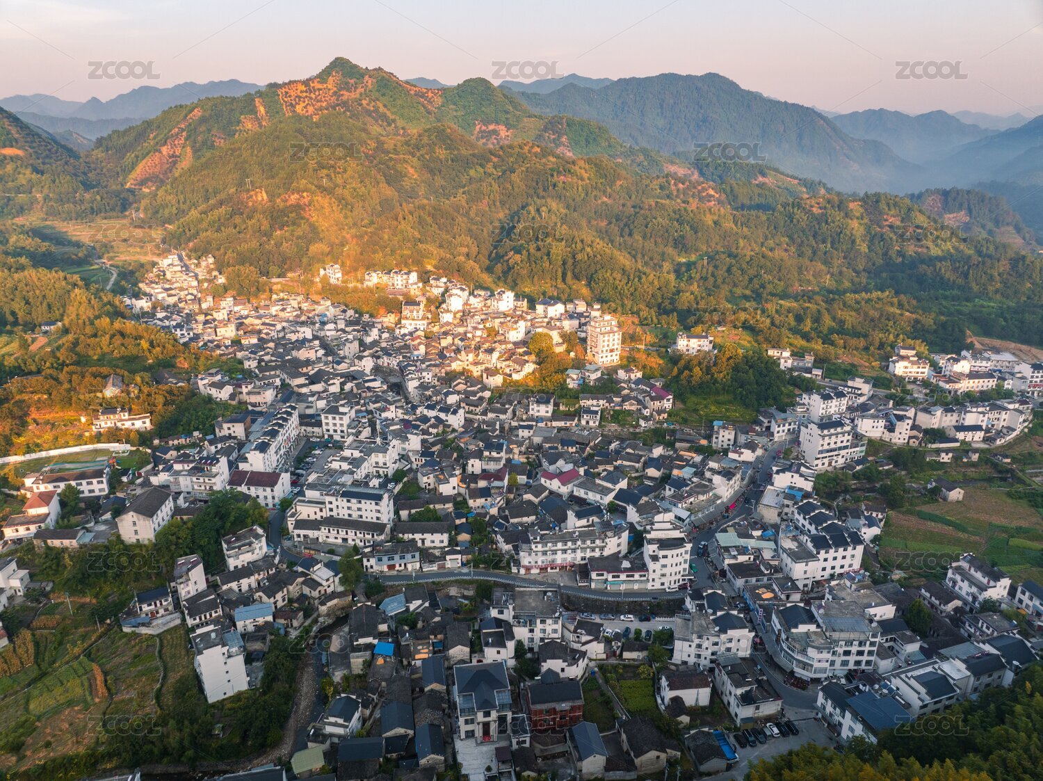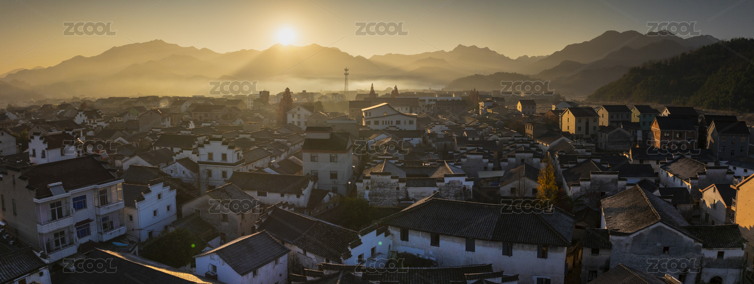 杭州桐庐深澳古村清晨日出全景宽幅航拍
