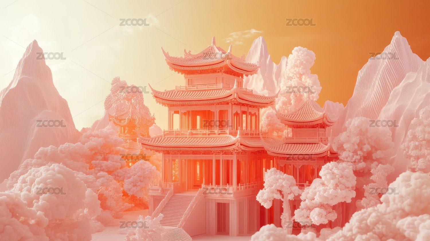 白色剪纸园林艺术建筑插画海报背景装饰画