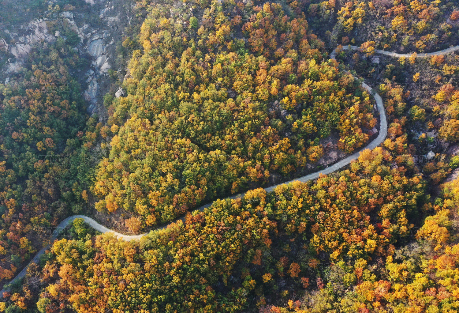山东枣庄莲青山上一条在秋天多彩树林中穿行的盘山路