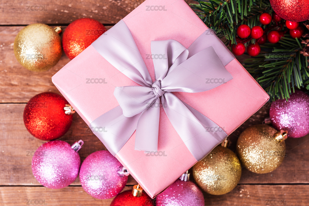 圣诞礼盒和圣诞节装饰品在桌子上,圣诞节节日礼物背景,粉色的礼盒和圣诞树,圣诞球,松果在桌子上