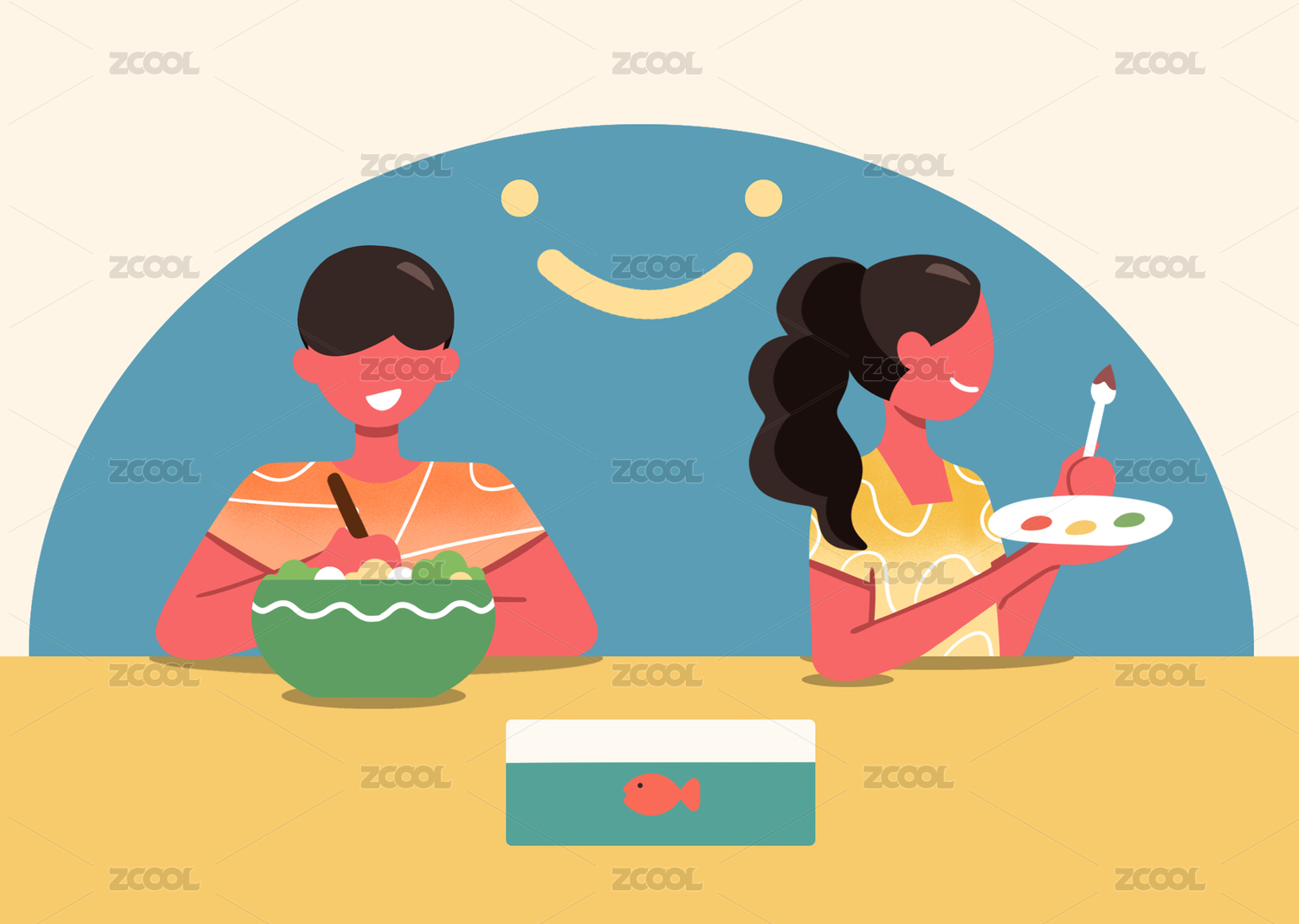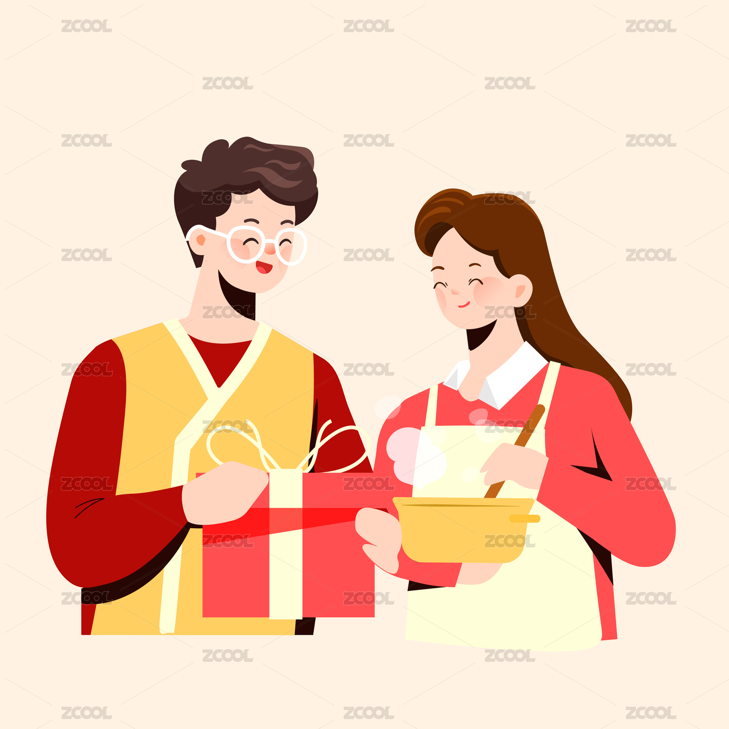 情侣厨房一起做饭烹饪美食健康餐饮饮食插画