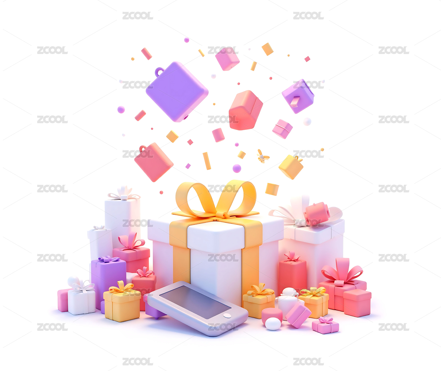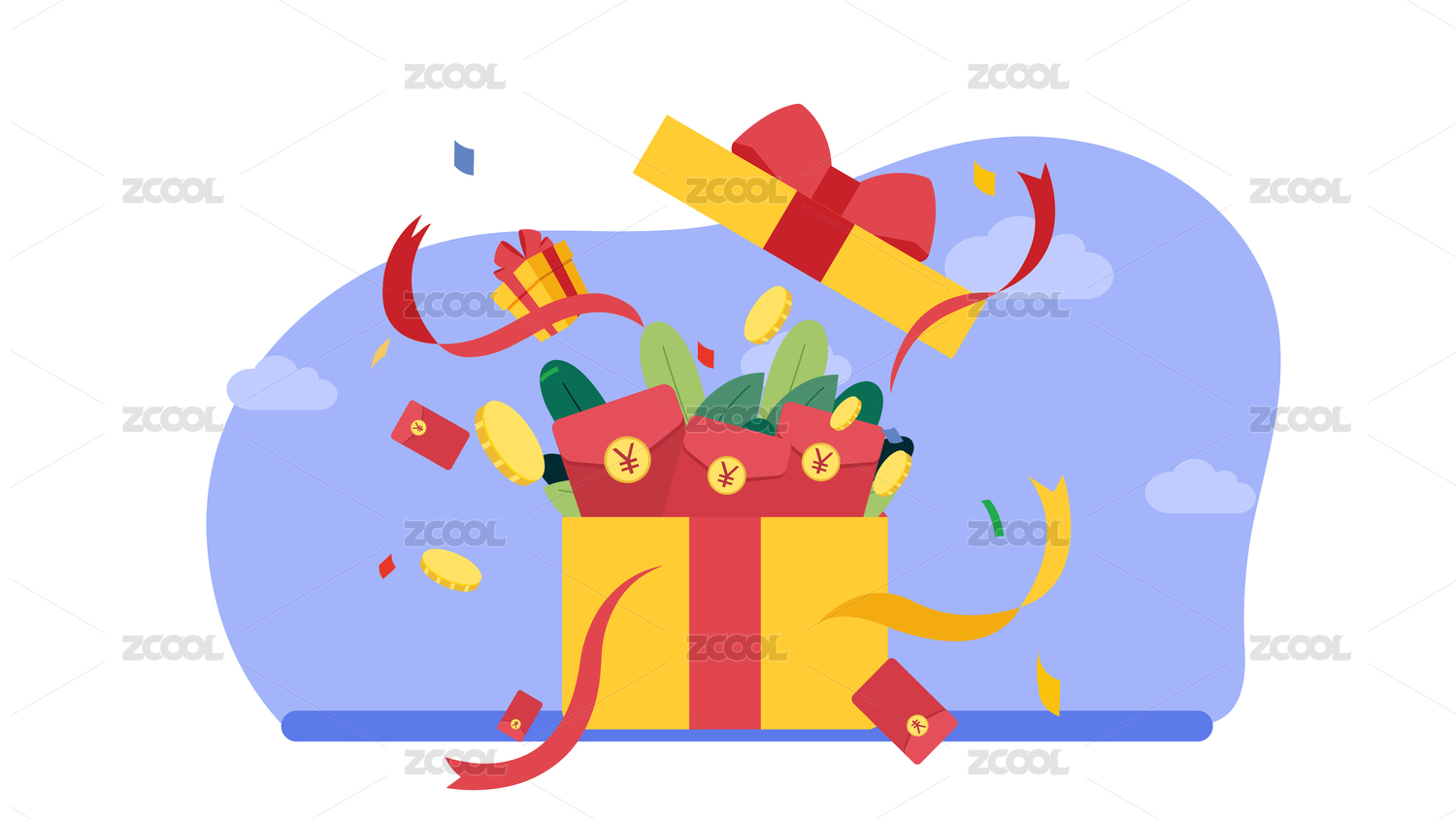 多种礼品盒和欢乐跳跃人物的矢量插画