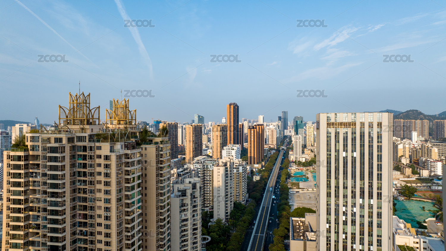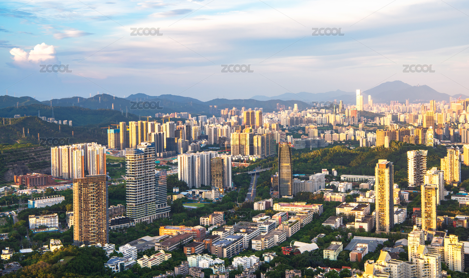 中国广东深圳南山夕阳下的高楼城市天际线风光