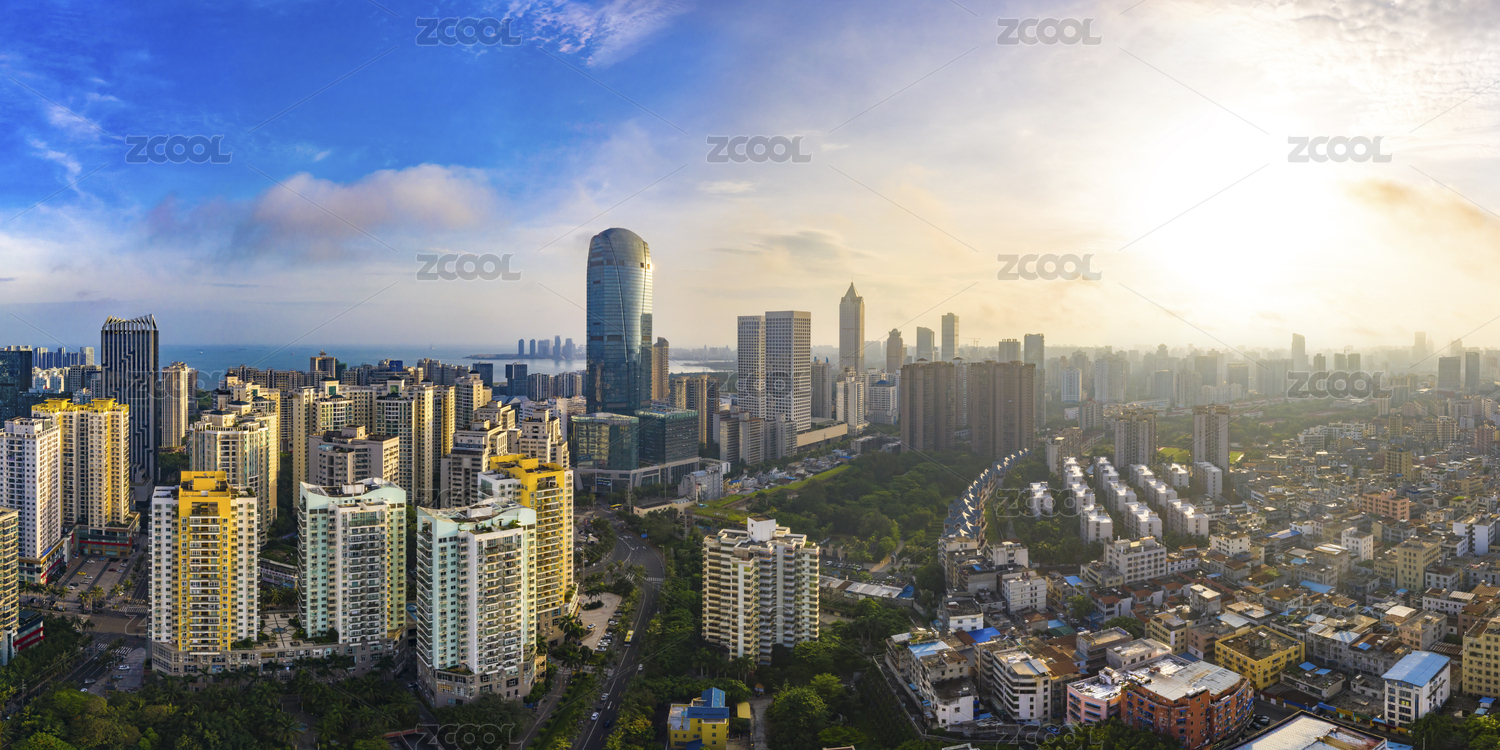 中国海南省海口市滨海核心区最高楼日出航拍全景