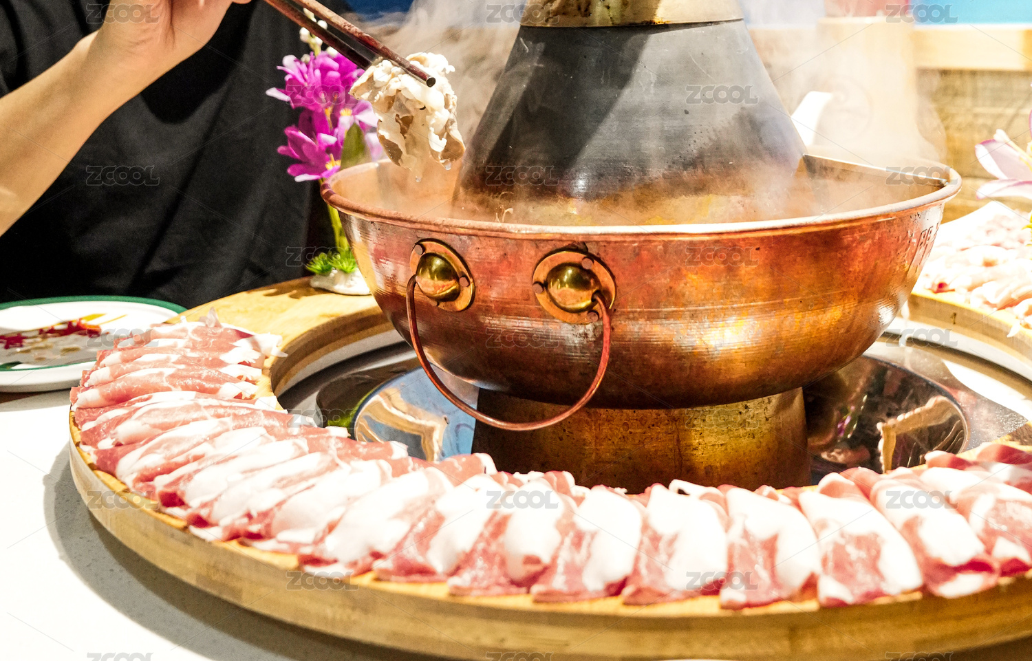 白色餐桌上的中国传统美食涮羊肉铜火锅和火锅食材